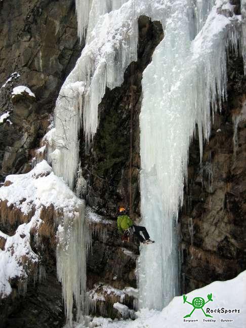 Bini bekommt den steilen Zapfen, der durch ein Eisdächen abgeschlossen wird, ich beneide ihn, sieht echt geil aus.