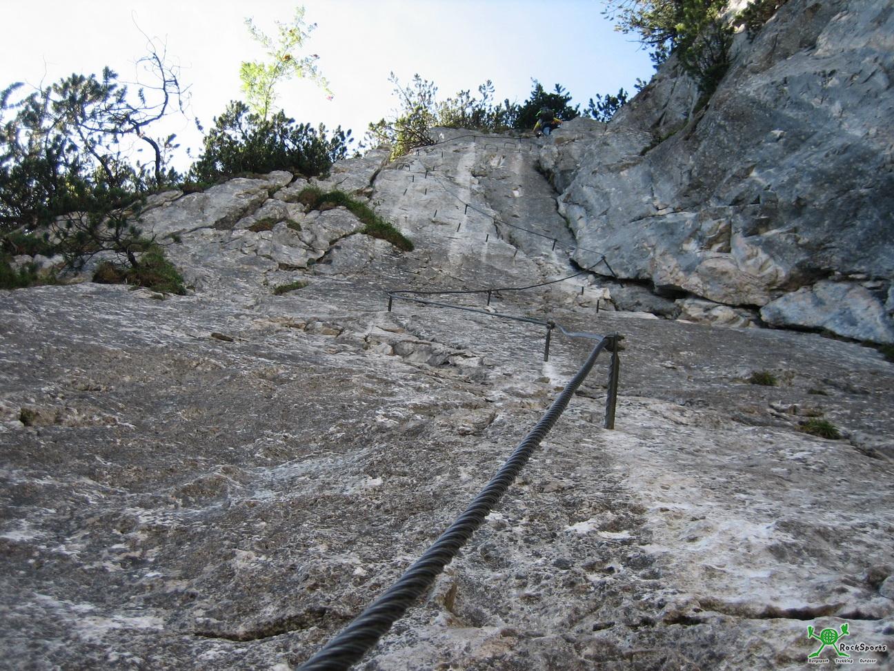 Der Zustieg zum Steig führt recht gemütlich durch einen Wald an die Wand. Er ist mit ¾ Stunde angegeben. Irgendwann sieht man dann schon die aufstellende Wand, durch der der Steig führt. Der Steig ist komplett mit einem Drahtseil gesichert und in einem gutem Zustand.