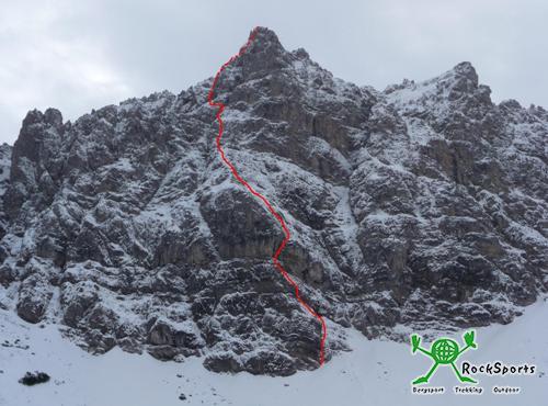 Seit Juni 2009 gibt es durch die Nordwand der Lachenspitze oberhalb der Landsberger Hütte einen neuen Klettersteig. Aufmerksam bin ich auf die Nordwand erstmals richtig geworden bei einem Abstieg vom Wasserfallklettern 2008 zusammen mit Stefan. Damals konnte man schön seitlich auf den Nordwandpfeiler sehen und der Schnee auf den Bändern und in den Rissen beflügelte die Phantasie sich vorzustellen wo dort Routen existieren und was dort noch machbar wäre im Winter wie Sommer. Ein Blick in meinen heißgeliebten uralt Rother-Allgäu-Führer klärte mich dann schnell auf dass links über die Kaminreihe eine Tour verläuft und der Nordwandpfeiler an sich als auch die Nordwand beide schon von den zwei Winterkletterspezialisten Maier/Niederberger 04/1962 bzw. 01/1963 begangen worden sind.