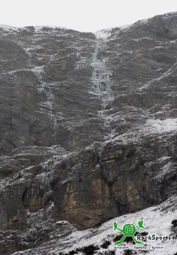 Mittlerweile hatte der Schneefall bzw. Schneeregen in richtigen Regen umgeschlagen und die Schneedecke war bereits spürbar durchfeuchtet. Gegen 14.15 Uhr war ich zurück im Winterraum und froh noch ein paar trockene Ersatzklamotten dabeizuhaben. Beim weiteren Abstieg zum Vilsalpsee zeigten sich bereits die Spuren der heutigen Erwärmung und des Regens da ein paar der fragilsten Eisgebilde an den Wasserfällen gen Tal gestürzt zu sein schienen.