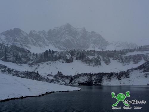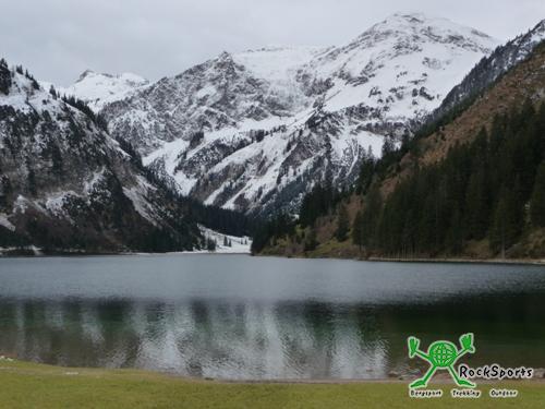 froh schon alles Im Auto zu haben um direkt durchstarten zu können. Herrliches Wetter umgab mich nach Durchbruch der Nebelgrenze bei Illertissen, jedoch rückte von Westen schon langsam dunkle Wolken an. Kurz vor 10 Uhrbin ich gerade noch pünktlich in Tannheim gewesen um hinter zum Vilsalpsee fahren zu dürfen (zw. 10-17 Uhr Einfahrverbot) und hatte am See dann den ersten Blick auf die Lachenspitze und auf die umliegenden Berge.