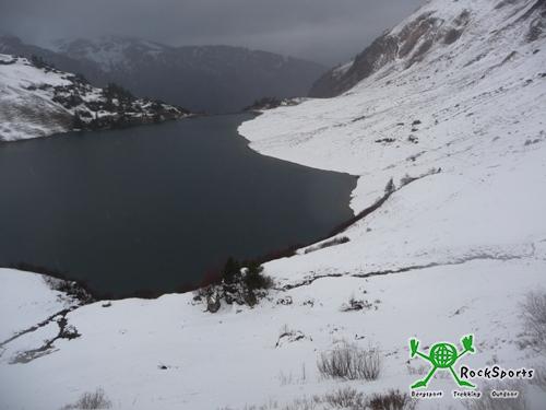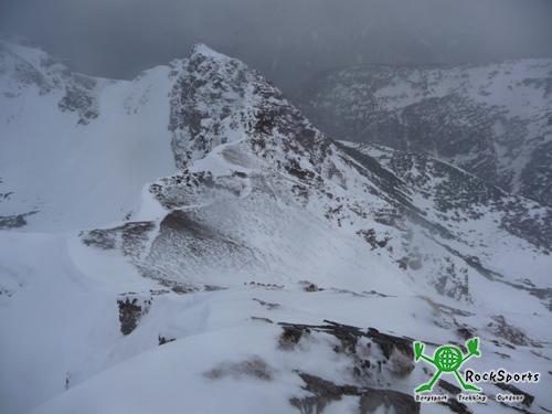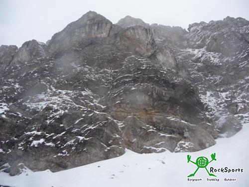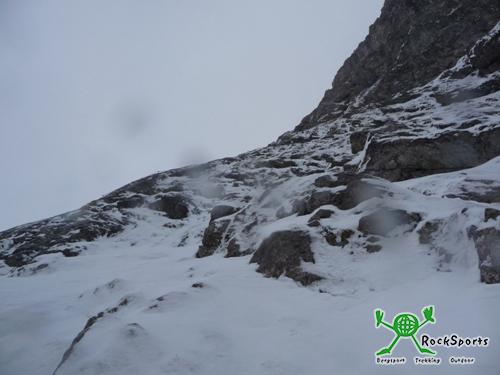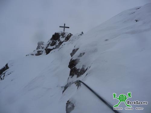 Der Schneefall/Schneeregen beschlug ständig meine Kamera bzw. setzte sich die Feuchtigkeit dort leider irgendwie im Gehäuse fest. Der Schnee war beim Zustieg ab Hütte überwiegend trocken, am Fels jedoch eher nass und nicht tragend. Nach versuchsweise Antesten über ein kurzes Stück ohne Steigeisen zog ich diese dann doch sehr bald an um nicht ständig wegzurutschen. So gings dann recht gut gen Gipfel.