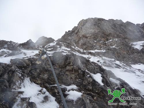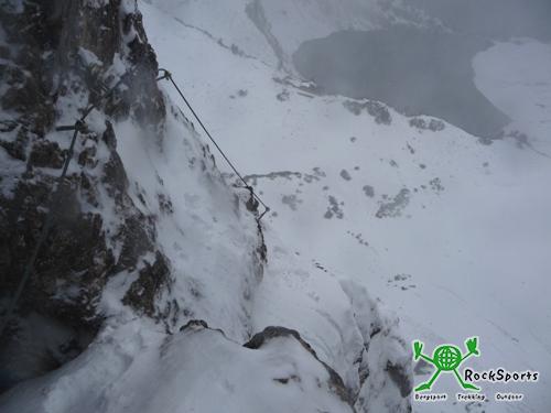 In zwei kurzen Flachpassagen war das Stahlseil mal ca. 5-10m zu tief unter dem Schnee vergraben. Diese Stellen gingen aber gut ohne Sicherung, bzw. mit etwas Mühe wäre das Seil vermutlich auch freizulegen gewesen.