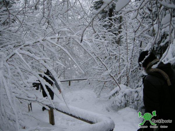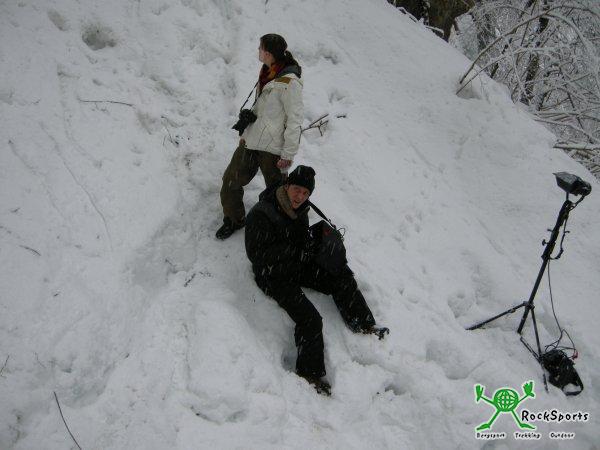 Wir sind nun also am Samstag von der Eistobelbrücke ins tief verschneite Argental abgestiegen, was mit der ganzen Ausrüstung der Filmcrew gar nicht immer so einfach war, aber die Mädels und Jungs waren gut drauf, so hat es jedem auch a bissel Spaß gemacht.
