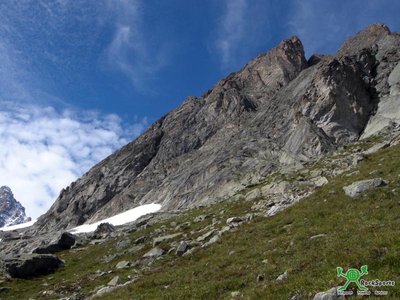 Ein kleiner Ausflug am Abend lässt mich noch das Ziel des morgigen Tages sehen und fotografieren. Mont Rouges de Triolet P.3289 - „Les chamois volants“ (5c / 18 SL / 800m). Gut fürs Foto. Am nächsten Tag werden wir den Berg leider nicht vor blauem Himmel sehen.
