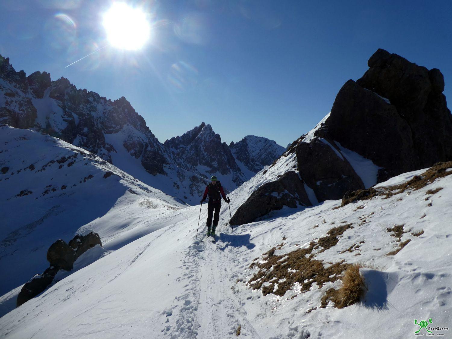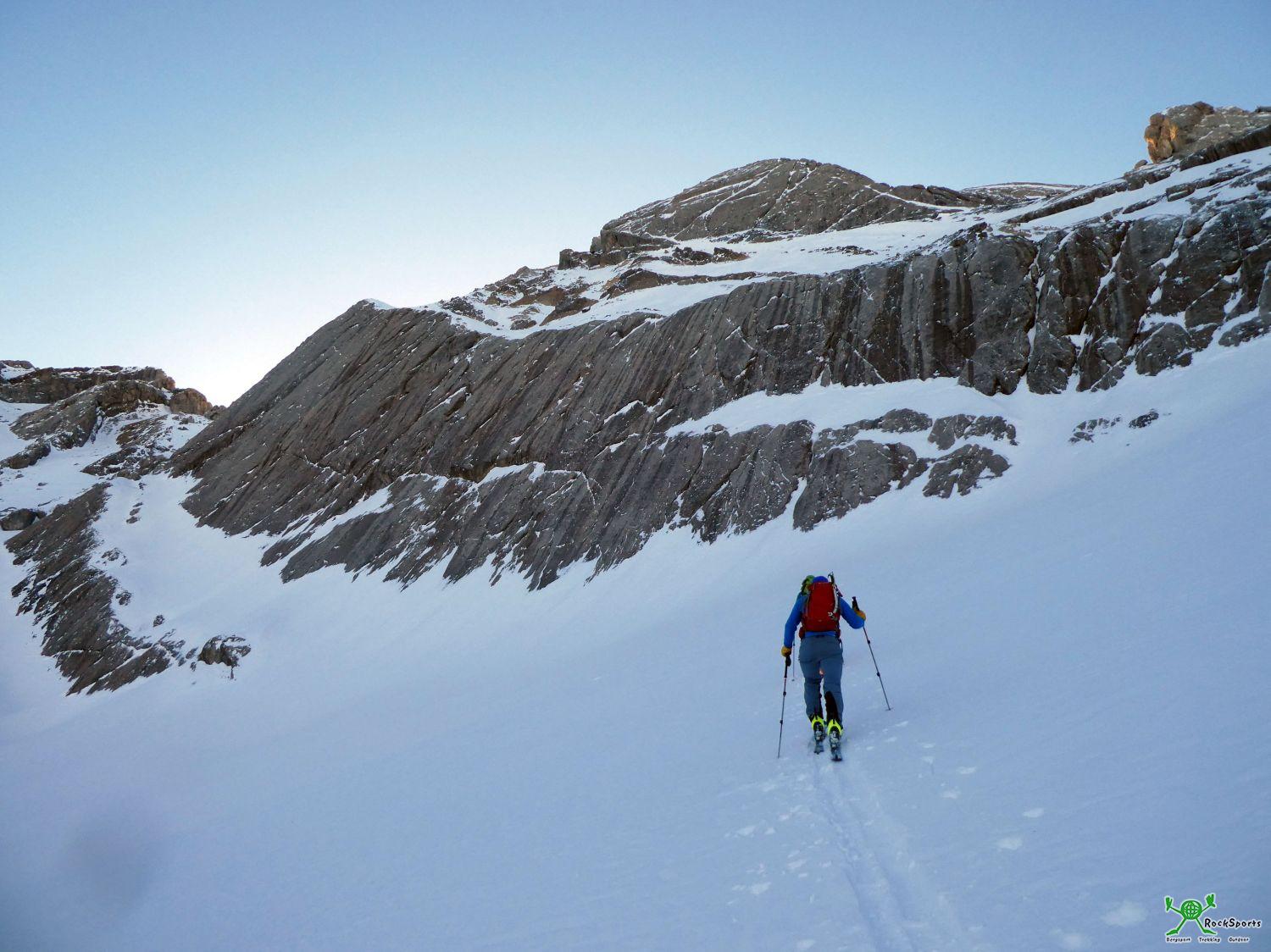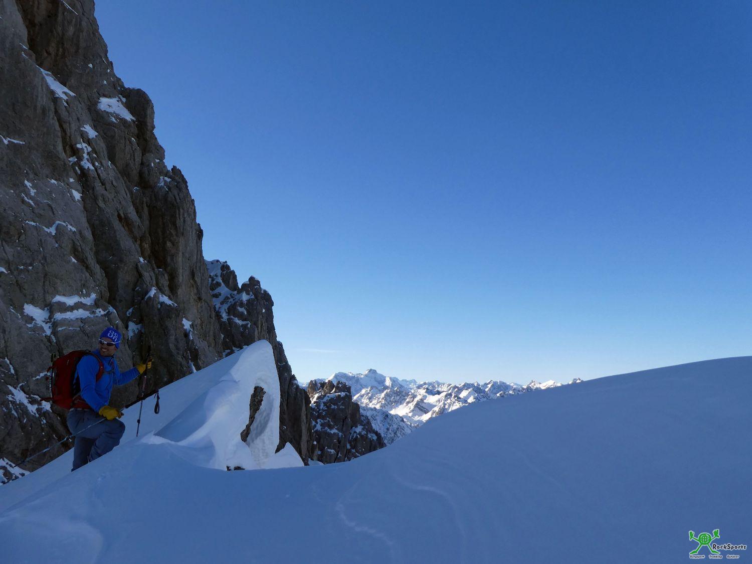 Nachdem es in den Tagen vorher Neuschnee unter Windeinfluss gegeben hatte waren auch bei uns die Verhältnisse am steilen Hang unterm Skidepot etwas fraglich. Es war der berühmte erste Schönwettertag nach 2-3 tägigem Schlechtwetter und es galt zu Spuren. So kam es dann auch das der steile Osthang direkt zum Skidepot hoch uns zu sehr mit Triebschneegefüllt erschien. So schnell gaben wir aber nicht auf. Wir begannen den Fußaufstieg deutlich früher und mogelten uns rechts entlang der felsigen Rippen und den Felsen entlang durch und folgten oben dem Grat entlang nach Links zum eigentlichen Skidepot. Ab dort erfolgte der Aufstieg über die übliche Aufstiegsroute bis zum Hauptgipfel der Großen Schlenkerspitze (2827 m).