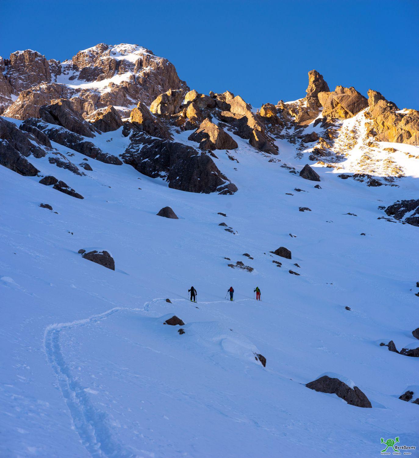 Im Anschluss an die Große Schlenkerspitze stiegen wir aus dem hintersten Fundaistal wieder auf und machten uns auf den Weg zur Reichspitze. Bis zum Skidepot war an diesem traumhaften, windstillen und sonnigen Tag einiges los und es herrschte reger Betrieb. Zunächst folgt zu Fuß ein langer flacher Gratabschnitt bei dem einige Felsrippen umgangen oder überstiegen werden müssen bis man an eigentlichen Gipfelaufbau kommt. Einige Leute kamen uns hier wieder entgegen die umgekehrt waren. Lediglich ein Vater mit Sohn spurte und kletterte mit Seil sichernd, den im Sommer vorhandenen Drahtseilsicherungen entlang bis zum Gipfel. Bald wieder zurück am Skidepot folgte eine tolle Abfahrt durchs Fundaistal.