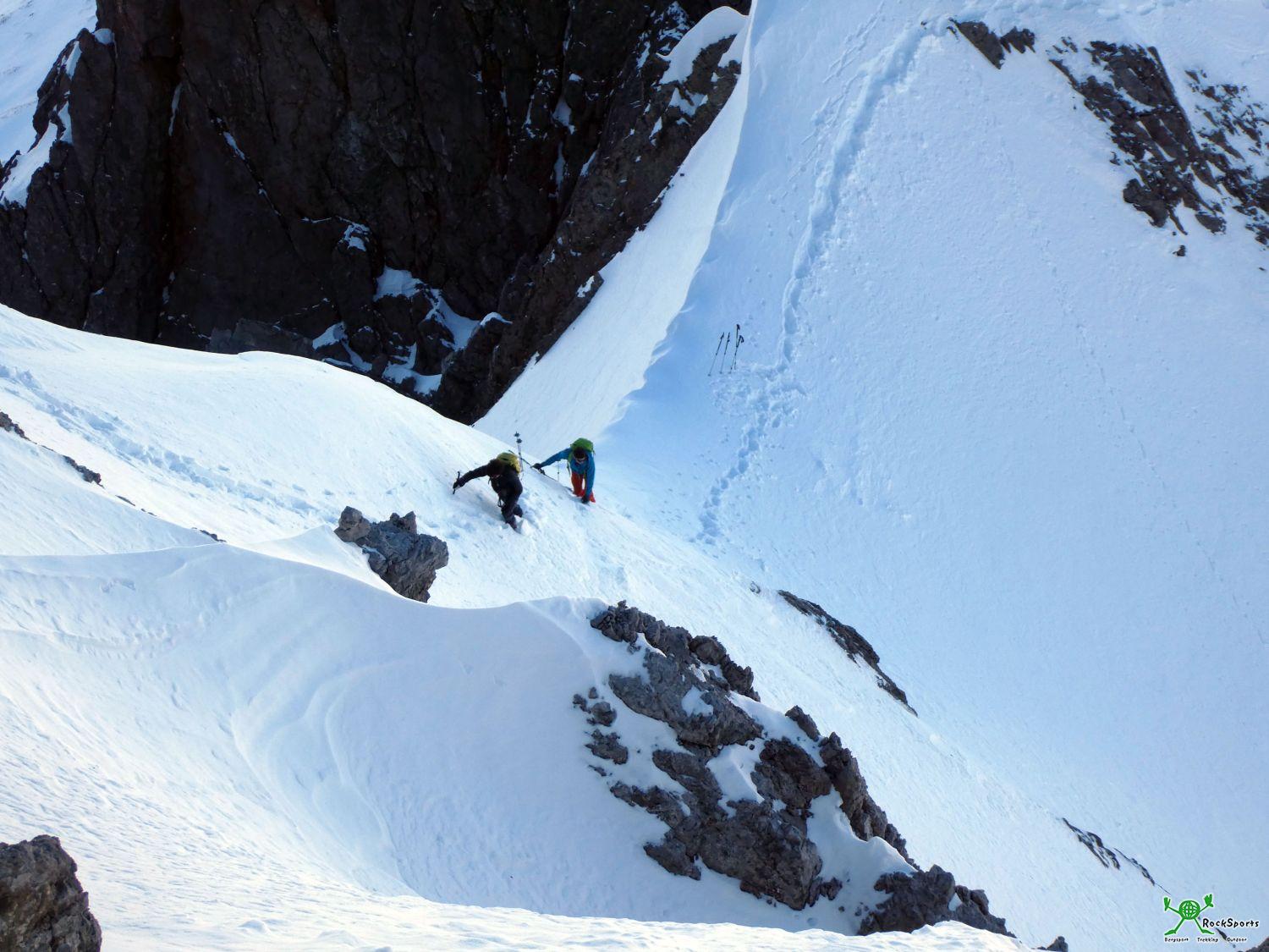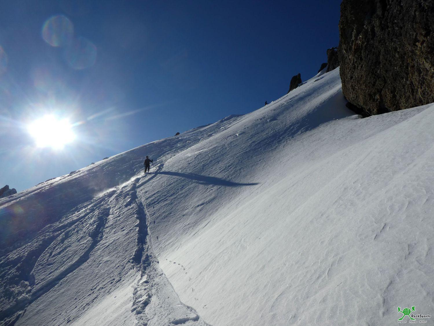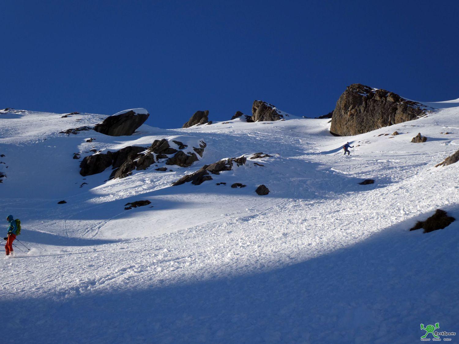 Rechts in und an den Felsen entlang mogelten wir uns am heiklen Triebschnee vorbei