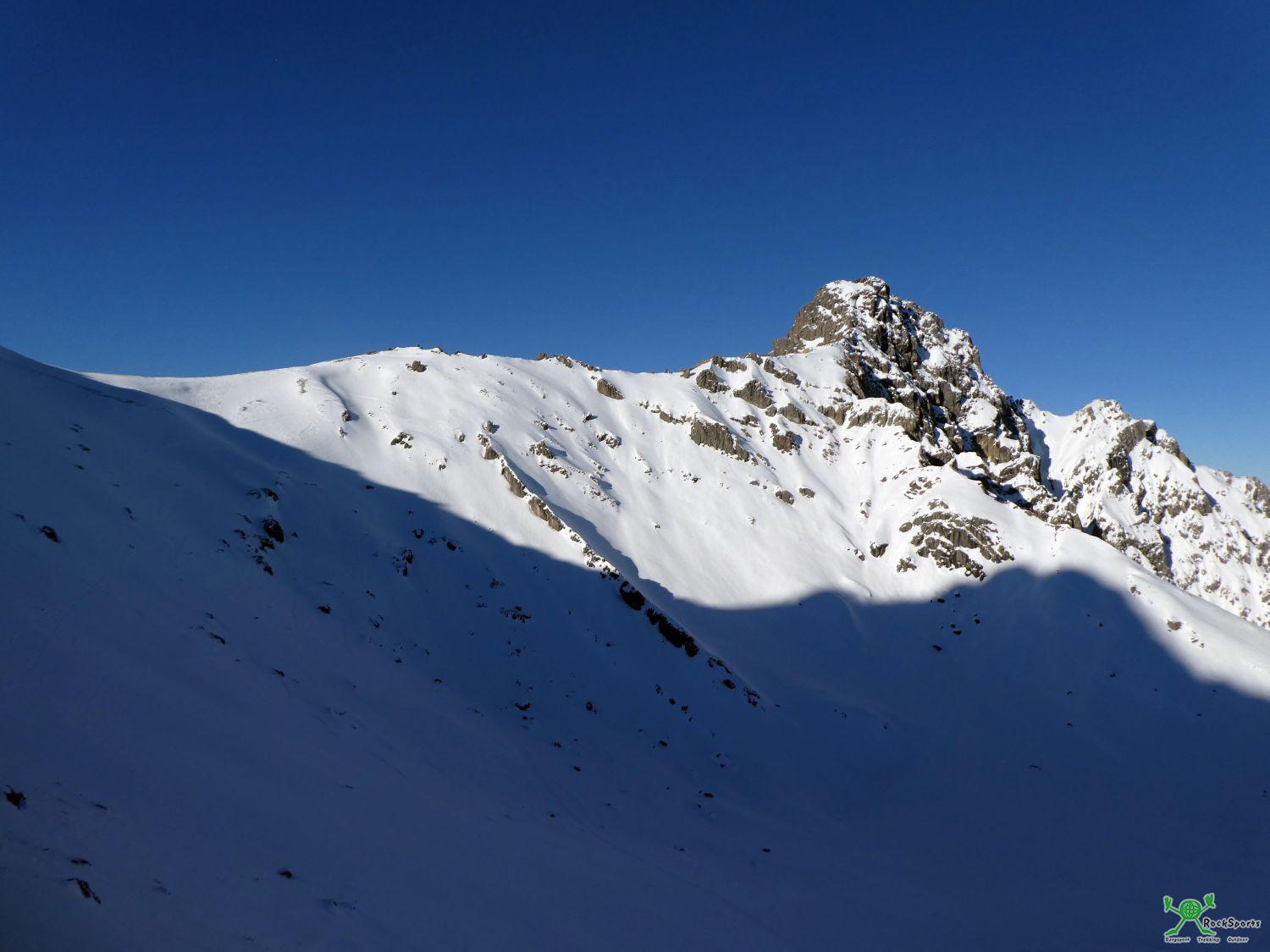 Blick vom Vorgipfel zum Hauptgipfel. Die Rinne im Vordergrund geht es runter und leicht linksausholten geht es hoch zum Hauptgipfel