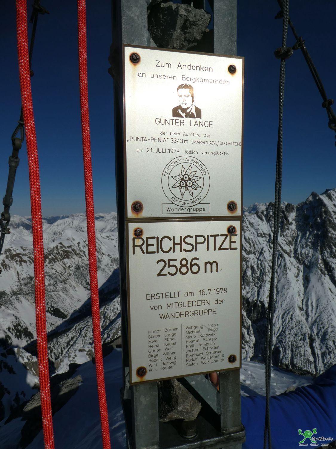 am Gipfelkreuz der Reichspitze (2590 m). Das Gipfelkreuz steht am wenige Meter niedrigeren Nebengipfel