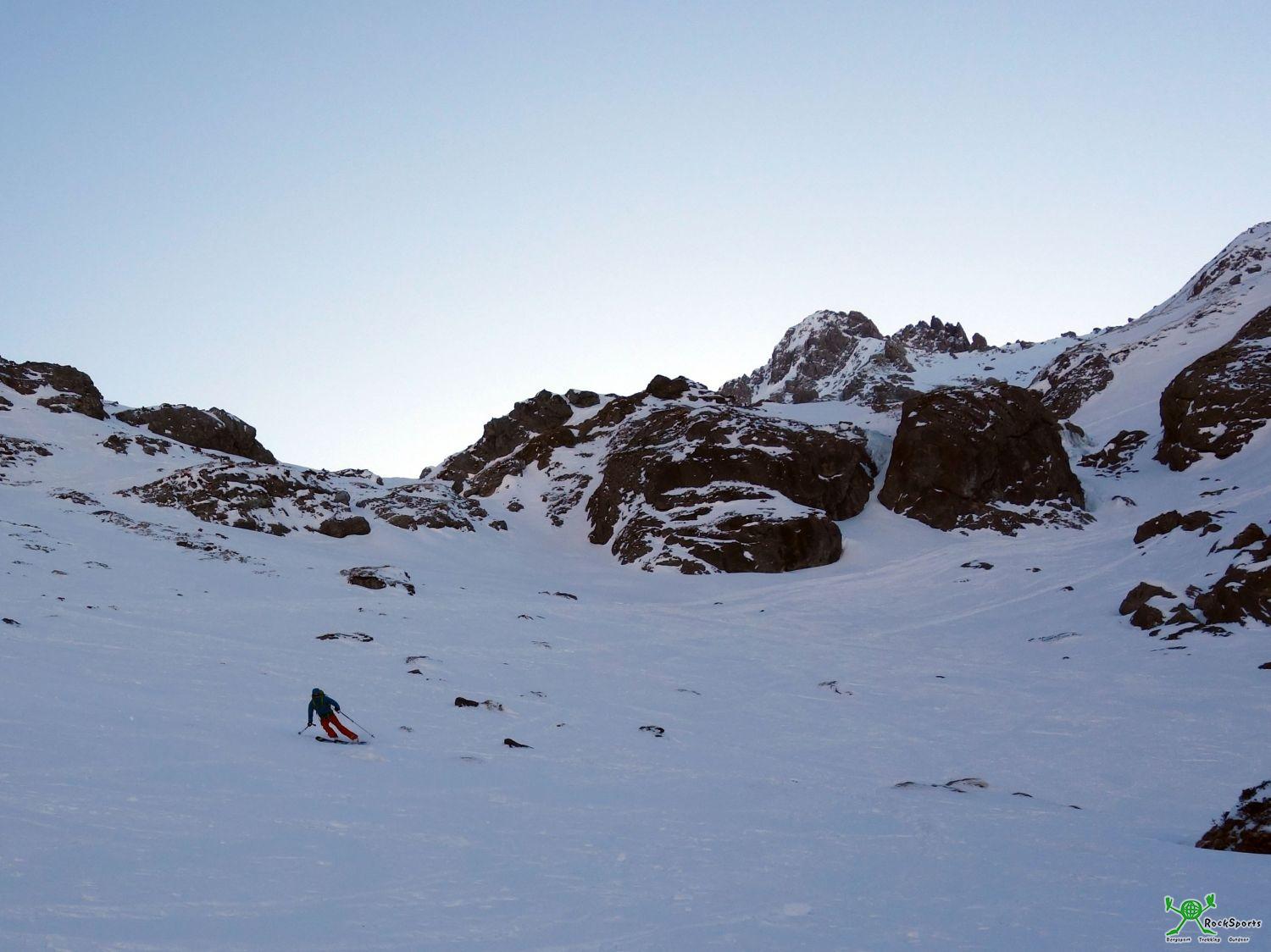 Das steile ostseitige Gelände unterhalb des üblichen Skidepots in der höchsten muldenartigen Einschartung