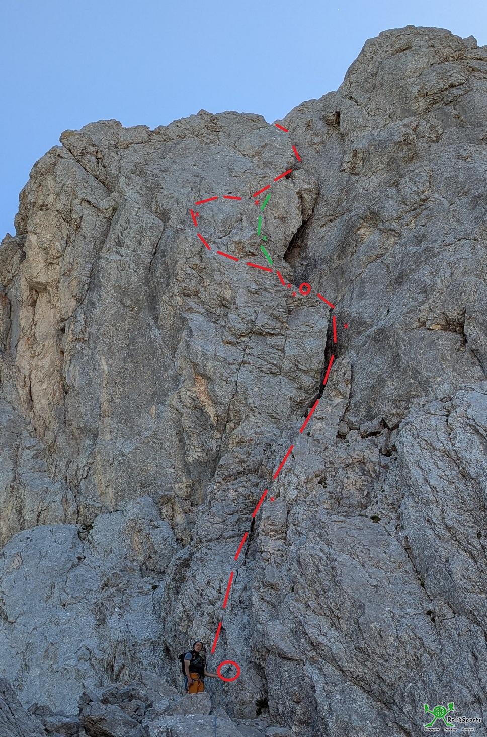 Übersichtsbild der letzten beiden Seillängen im Blenkkamin mit X für Bohrhaken. Linke Variante 5-, grüne Direktvariante 5+