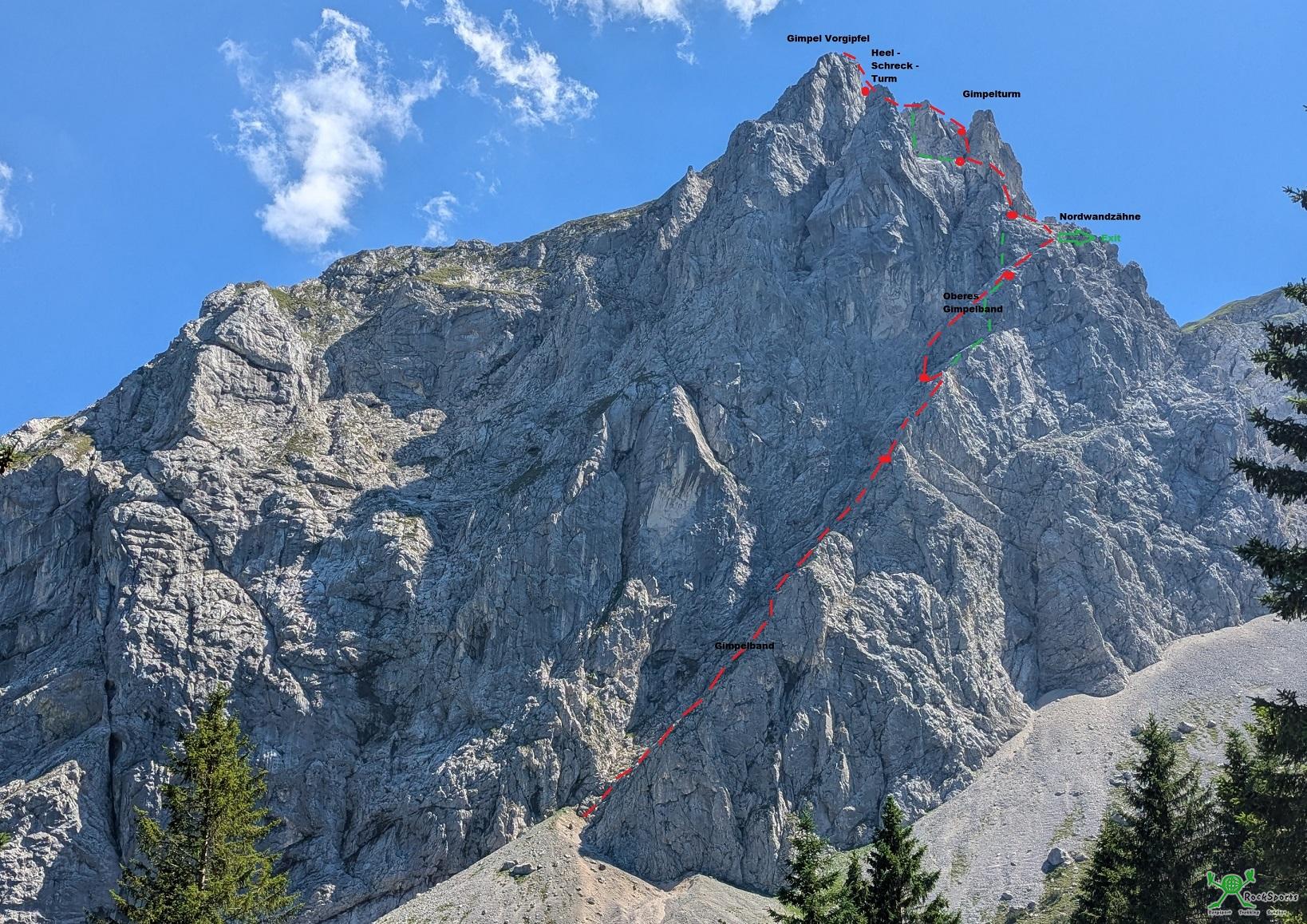 Übersichtsbild Gimpel Nordwand mit Routenverlauf und unseren Standplätzen, rot entspricht unserer Kletterlinie, grün sind Varianten