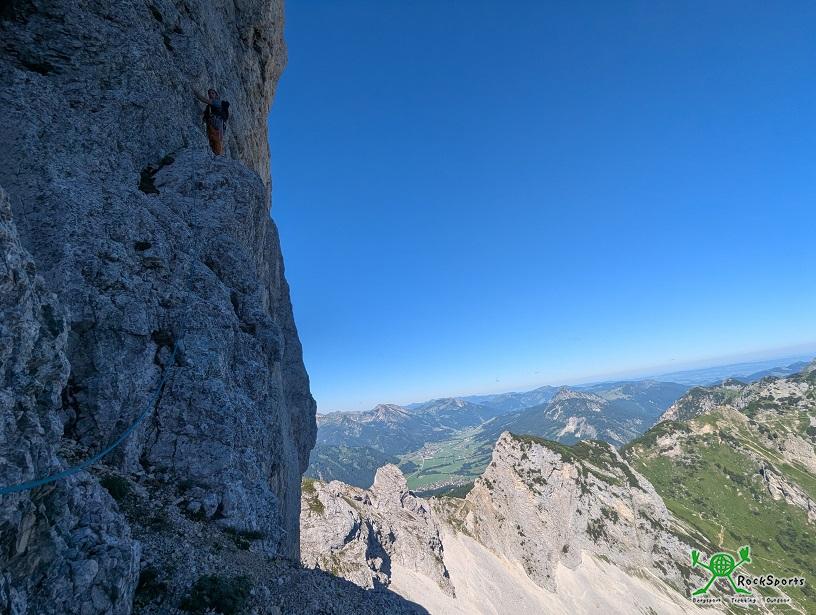 Am Ende des oberen Gimpelbandes mit anschließender Rechtsquerung wurde die Kletterei ansprechender. Hier zweigt links auch eine