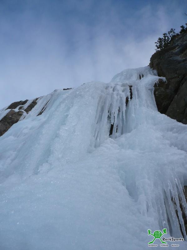 Dieser Eisfall bietet Genußklettern im Grad WI3 , unten leichter und oben bisle schwerer und ca.220m hoch.