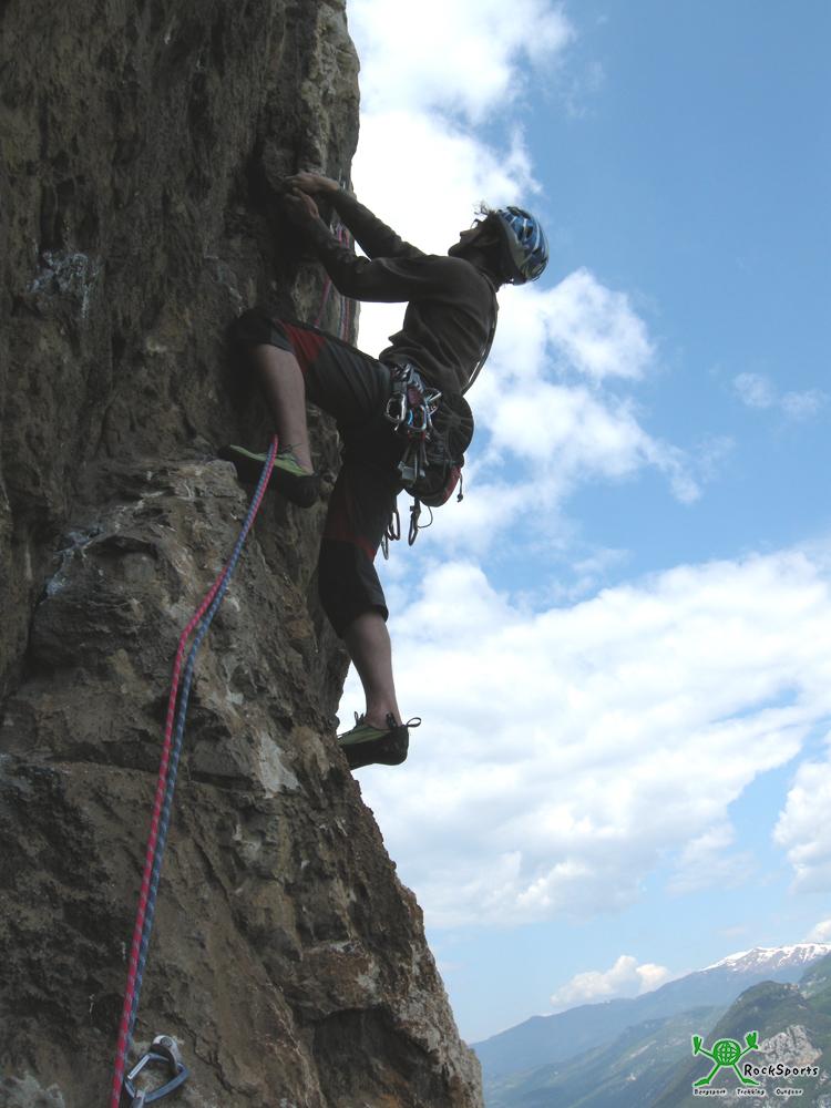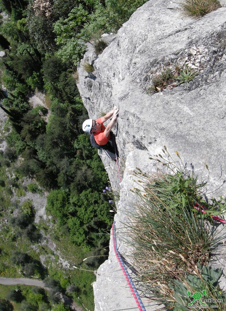 Noch eine 7a Länge und die rein klettertechnischen Schwierigkeiten sind hinter einem. Vom Stand weg geht es in senkrechter Plattenkletterei empor, bevor es in braunem und rötlichem Fels wieder überhängend wird. Vor dem Stand nach dem überhängenden Teil ist hier mit 3 großen Hakenabständen jedoch die moralische Schlüsselstelle der Zanzara zu sehen. Rückzugsspuren machen dies ebenfalls deutlich.