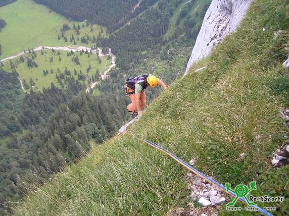 Nun gehts los, die Schlüsselstelle, sehr schwierige Passage, dafür aber gut gesichert. So zieht es auf das große Grasband.