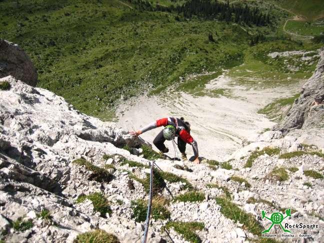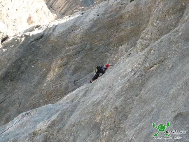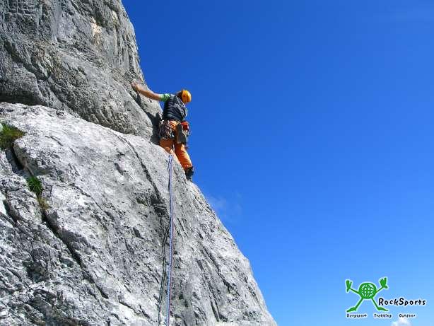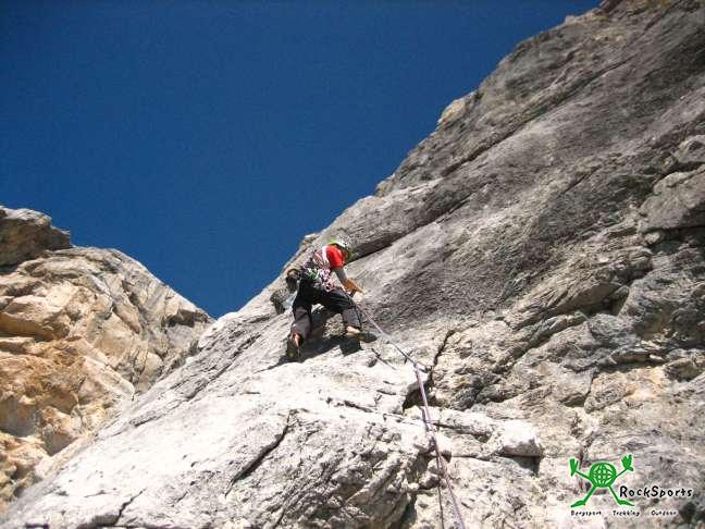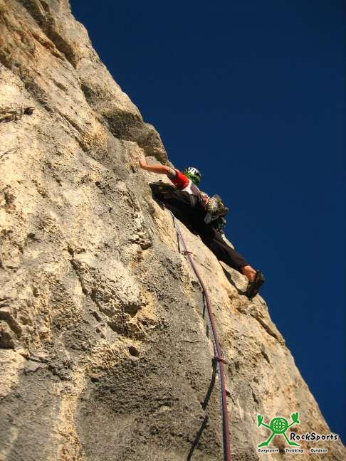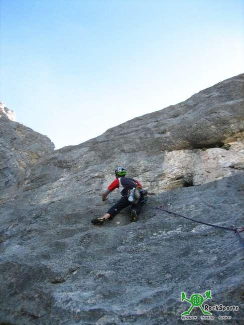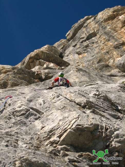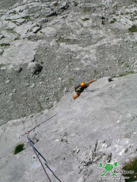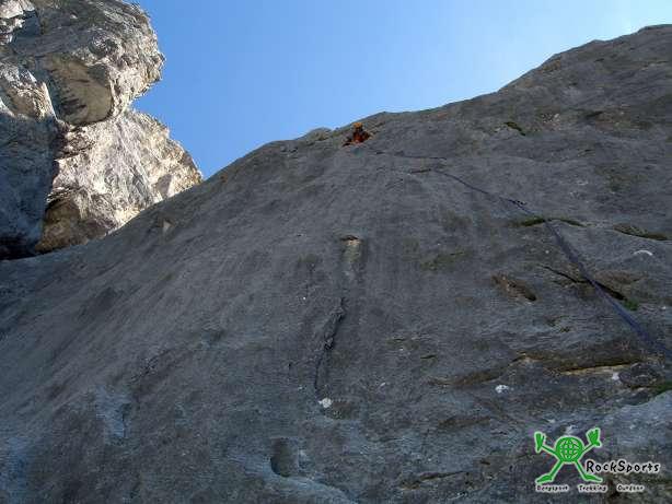 Dahin zu kommen, muss aber erst mal der eine oder andere 7ner erlegt werden. Gleich der erste eine anfangs Plattige später recht pumpige Seillänge an einer Piazschuppe blässt einen richtig auf.