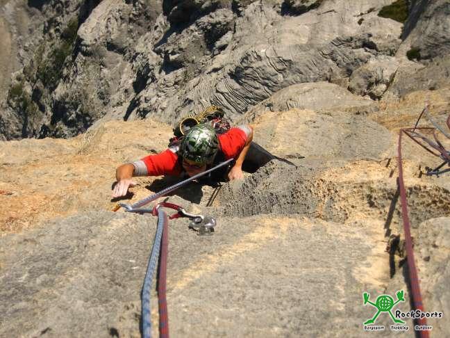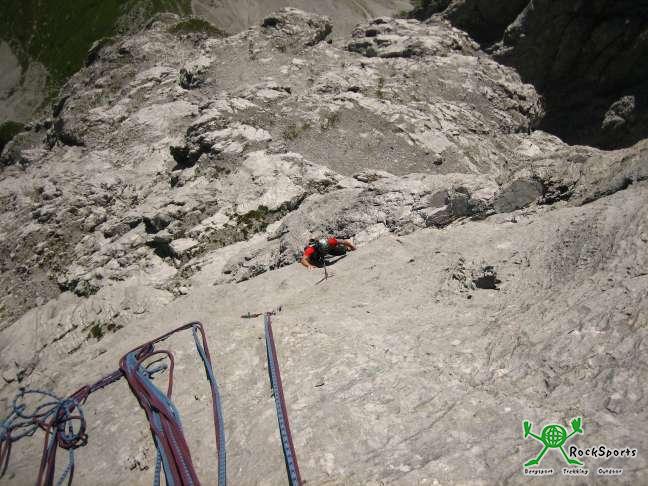 Nun folgen einige 6 und 6+ Längen und mit einem kurzen 7er geht es aufs große Band, hier etwas kiesig mittels einer leichten Platte an die Headwall. Nun ist es echt kompakt und es gibt auch keine Bänder mehr. War die Kletterei unten schön so wird sie nun fantastisch. .