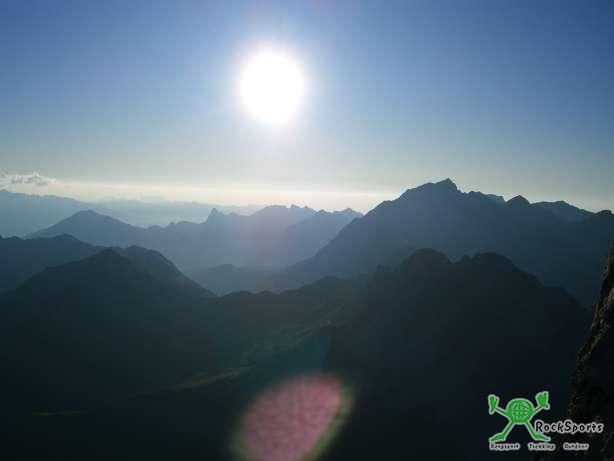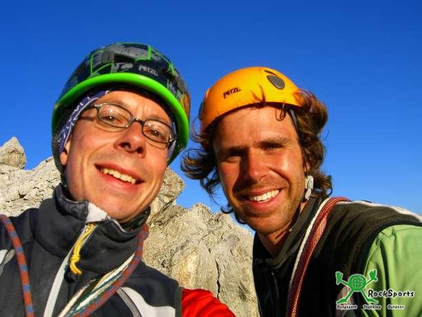 Im Sonnenuntergang geht es die Drusenfluh Nordseite hinunter und wir kommen übers Schweizer Tor schnell wieder an die Rucksäcke.