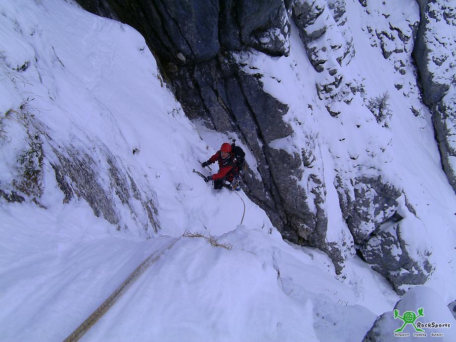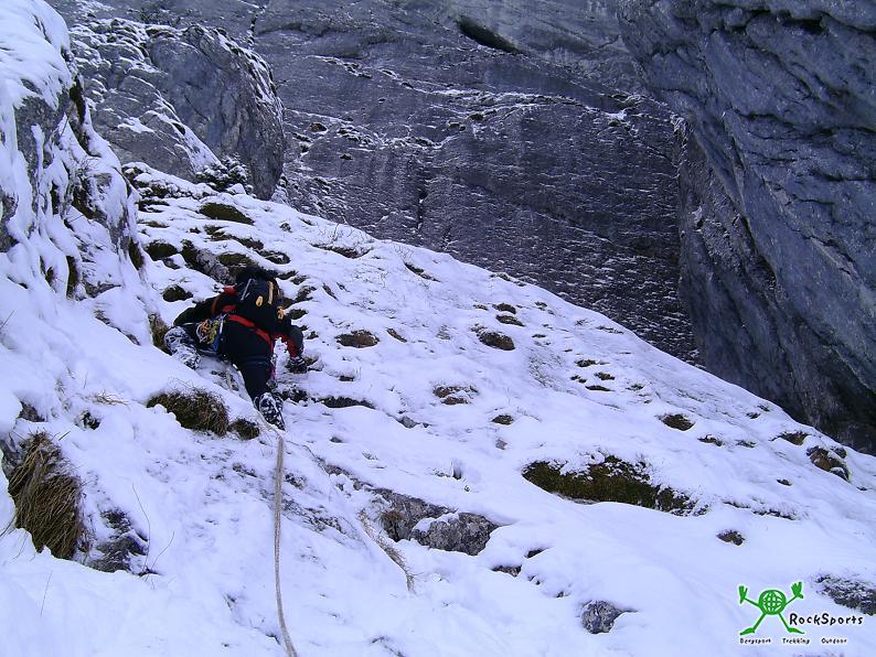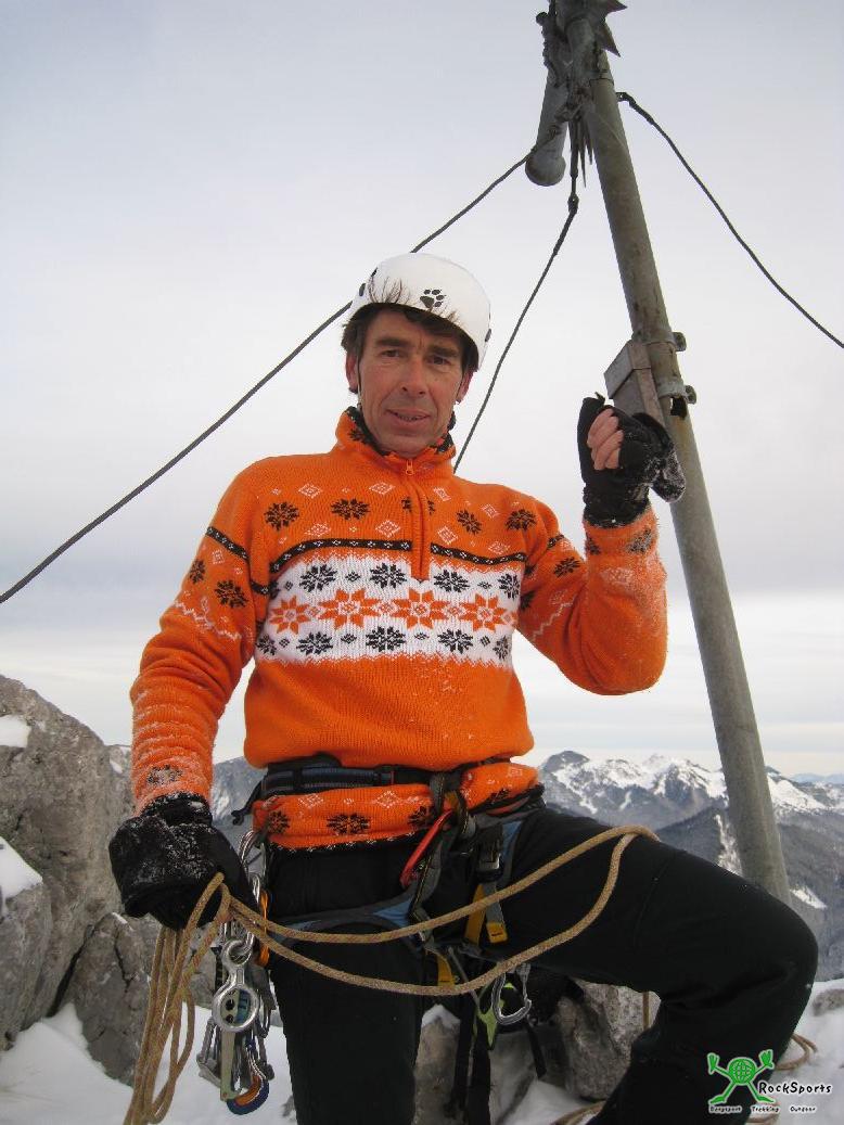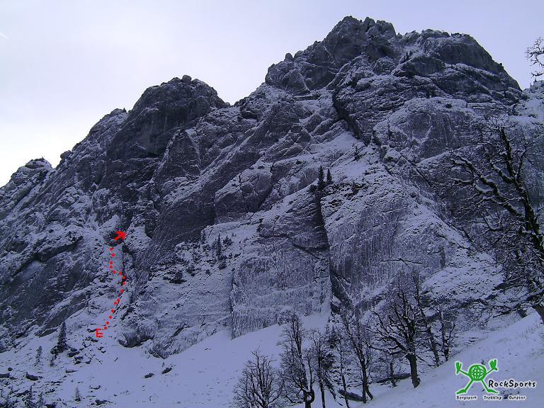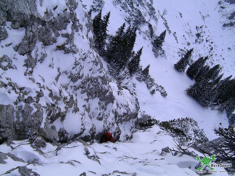 Nach kurzer Pause weiter mit Steigeisen + Eisgeräten über teilweise ekelig zu erzwingende Steilstufen hinauf zum versteckten Beginn der NO Schlucht. In dieser über kurze Steilstufen, unter einem Riesenklemmblock hindurch, immer gerade hinauf bis zum allerhintersten Ende der Schlucht. Hier senkrecht den ca. 10 Meter hohen Schacht hinauf ( sehr gutgriffig - schaut von unten grimmiger aus als es ist ) und man steigt nun überrascht in der Scharte zwischen dem 1ten Ostgratturm und dem Hauptgipfel aus einem Loch. Der eigentlich geplante Ostgrat war nicht begehbar ( puderiger Neuschnee - uns zu gefährlich ), also am Wandfuß entlang hinüber auf die Westseite und über den normalen Westanstieg ( erst Rinne, zuletzt kl. Kamin ) hinauf zum Gipfel. Abstieg wie Aufstieg zum Wandfuß. Für den weiteren Abstieg wählten wir den Weg über die Röthensteiner Alm.
