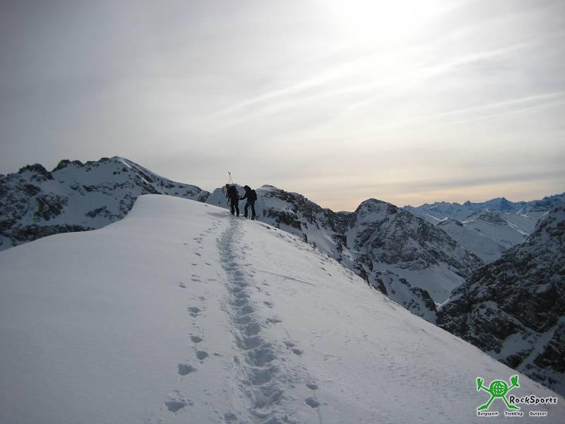 Der Linkerskopf zählt im Allgäu zusammen mit der Elferrinne zu den schwierigen Skitouren und ist nicht in jedem Winter möglich. Oft ist die Lawinenlage zu kritisch und kann vor allem schon im Aufstieg zur Enzianhütte (längere Hangquerung) ein Problem sein. Da es aber zur Zeit an Schneemassen mangelt und die Lawinenlage für Sonntag gut genug gemeldet war, entschlossen wir uns den Angriff zu wagen. Wir starten früh um 6 Uhr in der Birgsau, es ist noch dunkel und durchaus auch kalt. Der Weg ins Rappenalptal ist mit einer Spur versehen, welche uns den Aufstieg deutlich erleichtert. Bis zur Peters Alpe ist die Schneehöhe minimal und so müssen wir manchmal die Skier tragen. Wir finden schließlich den Anschluß an den Sommerweg, der zur Enzianhütte führt und der Schnee ist wieder mit uns. Meine Felle allerdings nicht mit mir! und so üb ich mich schon mal im Tragen der Ski. Noch ein ganzes Stück unterhalb der Hütte quert man einen Hang, welcher absolut sichere Bedingungen verlangt! Ein kleine Pause ist jetzt schon Gold wert. Der Aufstieg wird jetzt deutlich steiler und wir schnallen die Harscheisen schon mal unter die Schuhe. Der Gipfelweg ist gut einzusehen, weil sau steil, und uns wird schnell klar, wir brauchen die Harscheisen auch im Gras. Ab dem ersten Drittel halten meine Felle nicht mehr - heut ist aber auch der Wurm drin! - Ok, dann trag ich halt mal wieder. Steigeisen wären jetzt super, aber es finden sich heute immer wieder Stellen, die teiferen Schnee bieten und in denen es sich auch ganz gut stehen lässt. Von unten aus gesehen halten wir uns links vom Gipfel bis zum Beginn der Nordwestflanke. Dort angekommen brauch ich ne Pause, meine Tourenpartner Thomas und Michael sind heut deutlich fitter. Die 2 gehen mit den Skiern weiter, ich trag sie - verdammt! Die Steilheit lässt nicht nach, ganz im Gegenteil es nimmt nochmal deutlich zu, bis zu 45°. Die letzten Höhenmeter nehm ich die Ski nicht mehr mit und lasse sie kurz unterhalb der Steilstufe im Schnee eingegraben zurück. Hier zeigt sich der abwärts geschichtete Fels. Jetzt wirds heikel - man steht äußerst bescheiden mit den Skischuhen auf den nicht vorhandenen Tritten und so suchen wir die Seite mit der höchsten Schneeauflage, bei den heutigen Verhältnissen links direkt an der Nordwestflanke. Michi und Thomas nehmen die Skier mit bis zum Gipfel - Respekt!