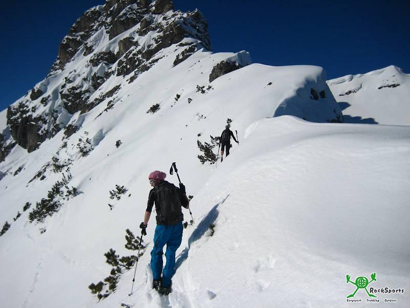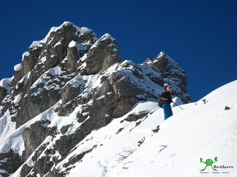 Der Litnisschrofen hat eine steile Rinne, die man schon beim Aufstieg ganz genau sehen kann und sie lockt mich schon seit langem. Heute scheinen die Bedingungen gut und wir versuchen es. Wie im Allgäuer Skitourenführer beschrieben steigen wir vom Haldensee im Tannheimer Tal aus auf. Es lohnt sich die Parkgebühr zu bezahlen, denn im Tannheimer wird stark kontrolliert. Der gesamte Aufstieg ist easy, wenn man auf der Südseite der Krinnenspitze bleibt. Oft sieht man unten schon Spuren aus dem Tobel kommen, der Aufstieg ist durch diesen aber unnötig steil und mit Latschen übersät. Auch heute sehen wir wieder in die steile Rinne hinein. Die Vorfreude steigt, denn der Schnee sieht heute noch powdermäßig aus, selbst auf der Südseite, über die wir aufsteigen ist der Schnee noch super. Kurz vor dem felsigen Gipfelaufbau steigen wir mit den Skiern bis zum Grat , um einen detailierteren Einblick zu bekommen.