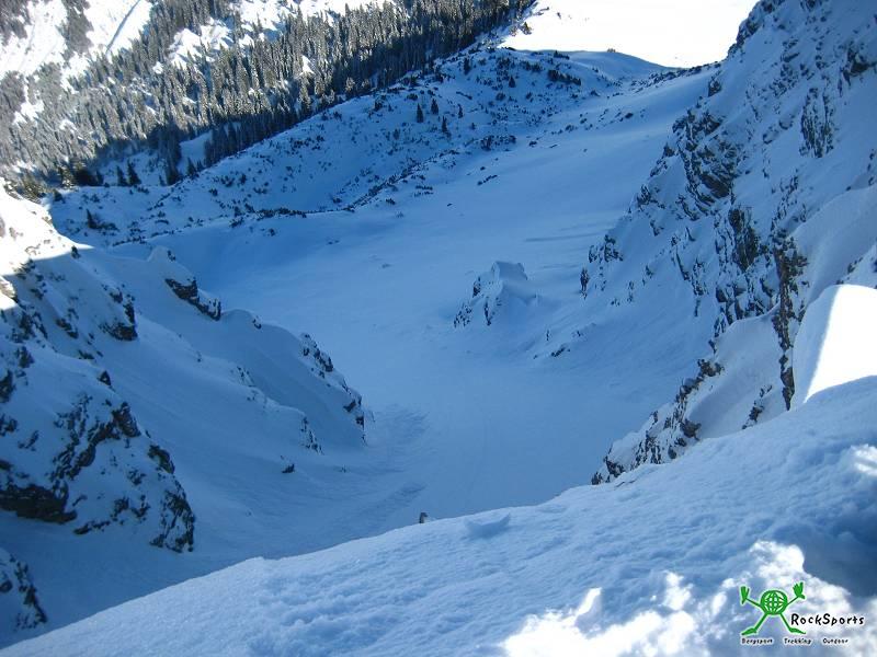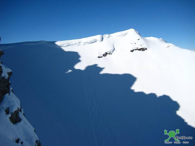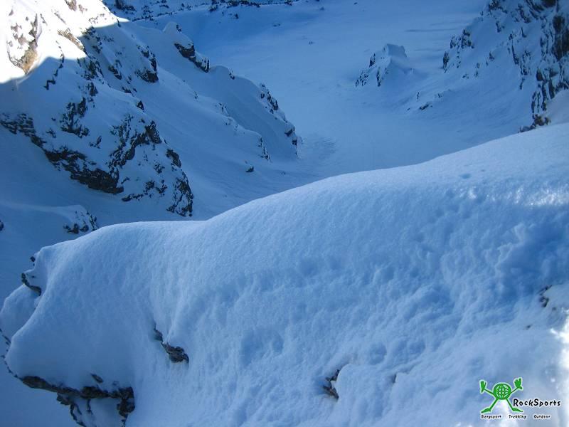 Die Rinne selbst..... wow echt nett, aber ganz oben wo man normaler Weise einsteigt, hängt heute eine riesige Wächte. Jeder von uns weiß Bescheid, keiner sagt was ...Verdammt, zu gefährlich!