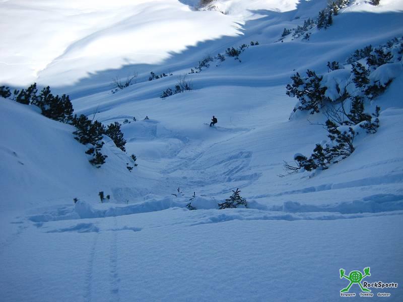 Bei der Abfahrt halten wir uns nicht an den Aufstiegsweg, sondern bleiben ab dem Sattel zwischen Krinnenspitze und Litnisschrofen auf der Nordseite. Der Schnee ist absolut mega genial und wir queren erstmal weit nach links. In Richtung Tobel haltend fahren wir ab und finden die perfekte Linie. Dort wo wir beim Aufstieg die Abfahrtsspuren aus dem Tobel gesehen haben, kommen wir jetzt tatsächlich auch raus, juhu!