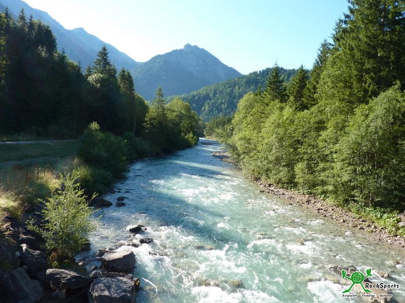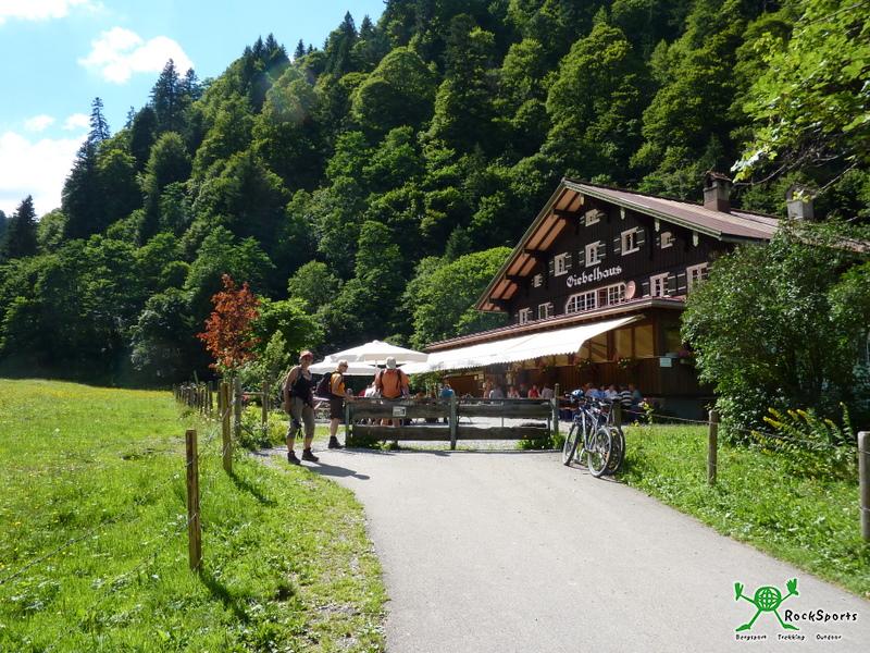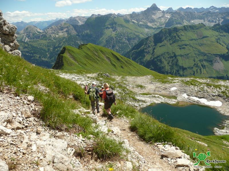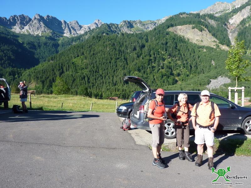 Ausgangpunkt unserer Tour zum Großen Daumen war der Parkplatz in Hinterstein 890 m (Parkgebühr 2,50 € pro Tag). Vom Parkplatz ging es zunächst einige Höhenmeter hinunter zur Fahrstraße, die zum Giebelhaus führt. Wir folgten der Straße, bis wir über eine Brücke die Ostrach überqueren konnten und ein Wegweiser zur Mösle-Alpe 1134 m leitete. Der Weg dorthin verlief zunächst noch flach bevor es steil durch den Wald hinauf ging. Weiter ging es, vorbei an der Nicken Alpe 1304 m und am Tösen-Bach entlang hinauf über herrliche Blumenwiesen zum Türle 1955 m. Von hier bot sich ein prächtiger Blick auf den Engeratsgundsee und auch der Weiterweg zum Großen Daumen, dessen Gipfel noch ca. 1 Stunde entfernt lag, wurde sichtbar. Nach ca. 4 stündigem Aufstieg erreichten wir bei herrlichem Wetter und einer grandiosen Rundumsicht den Gipfel des Großen Daumens. Der Rückweg erfolgte über den Laufbichelsee 2018 m und danach ging es hinab zum Engeratsgundsee 1876 m. Über die Gundles-Hütte 1621 m und Käseralm 1401 m ging es weiter zum Engeratsgundhof 1156 m und schon kurze Zeit später war das Giebelhaus 1066 m erreicht. Von dort ging es mit dem Bus (3,50 € pro Person) zurück zum Parkplatz in Hinterstein.