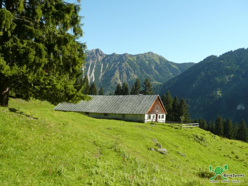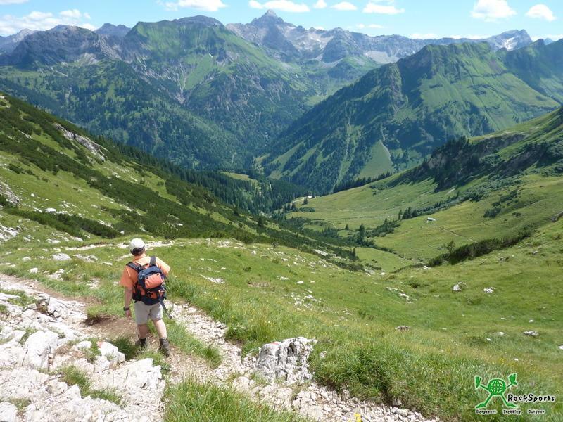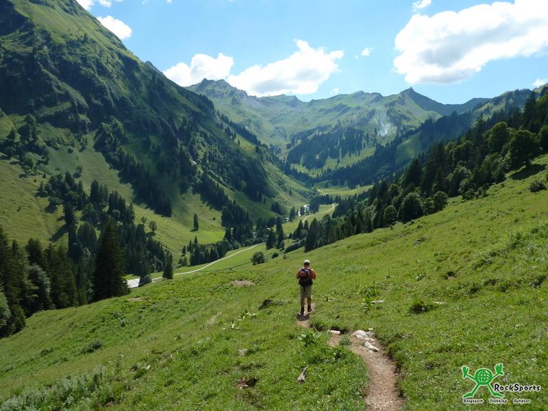 Abstieg zur Gundleshütte und zur Käseralm mit dem Hochvogel im Hintergrund
