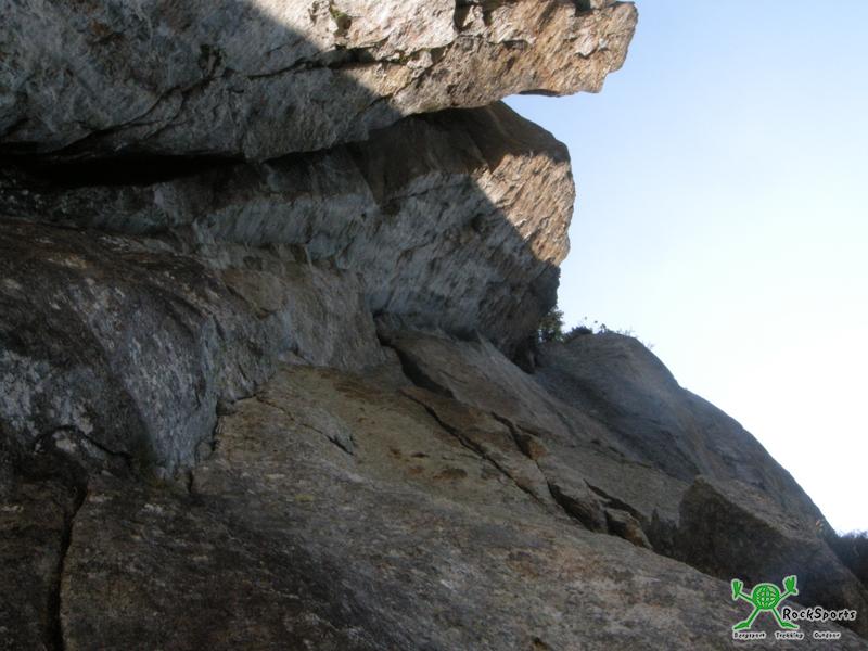Die 4.SL (VI+) ist mit 15 m sehr kurz und geht bis zum Beginn der rechten oder linken Rissvariante vor der Dachlänge. Nach dem Standplatzverhau folgt eine kurze Körperrissstelle, die gar nicht so unangenehm ist wie sie von unten aussieht. Standplatz nach 15 m an 3 NH am Beginn der rechten Variante. Da man eher links klettert muss man etwas schwerer 2 Meter nach rechts zum Standplatz queren (hier kam zum ersten mal unser größter Camalot #5, früherer Camalot #4, zum Einsatz). Topoguide klettert hier in der rechten Variante weiter und beschreibt auch nur diese. Diese sah uns aber wesentlich unangenehmer (breiter offener Kamin) und schlecht abzusichernd aus. So ging es für mich in unserer 5. SL vom Stand wieder kurz nach links in die linke Variante (Plaisir 6a+) und dem steilen Riss entlang hoch. Nach 30 m kommt man zu einem sehr unbequemen Stand an 3 alten NH. Hier empfiehlt es sich noch 4m nach rechts zu queren auf einen wesentlich bequemeren Absatz mit Stand an verschiedenen gefädelten Seilstücken. Von dort hat man einen beeindruckenden Blick nach oben in die kommende Länge unter den riesigen Dächern. Die Längen 4 und 5 könnten auch zu einer langen Länge zusammengefasst werden. Beim Blick nach unten sehen wir die erste folgende Seilschaft ins Risssystem kommen und staunen etwas, denn es sind tatsächlich die unscheinbaren kalifornischen Mädels vom Nachbarzelt.