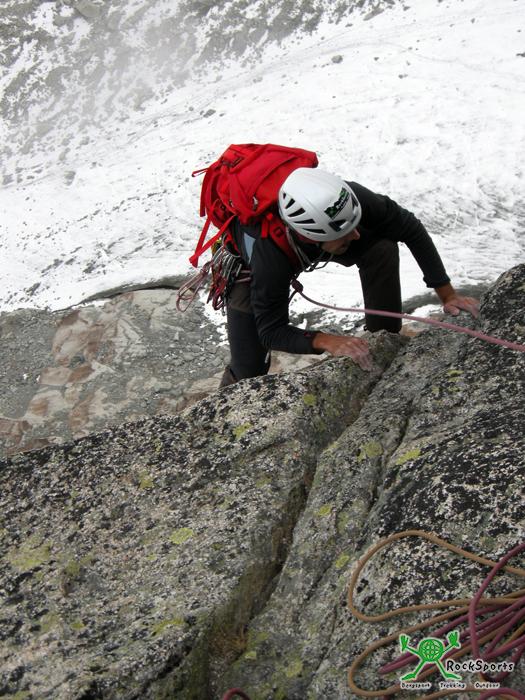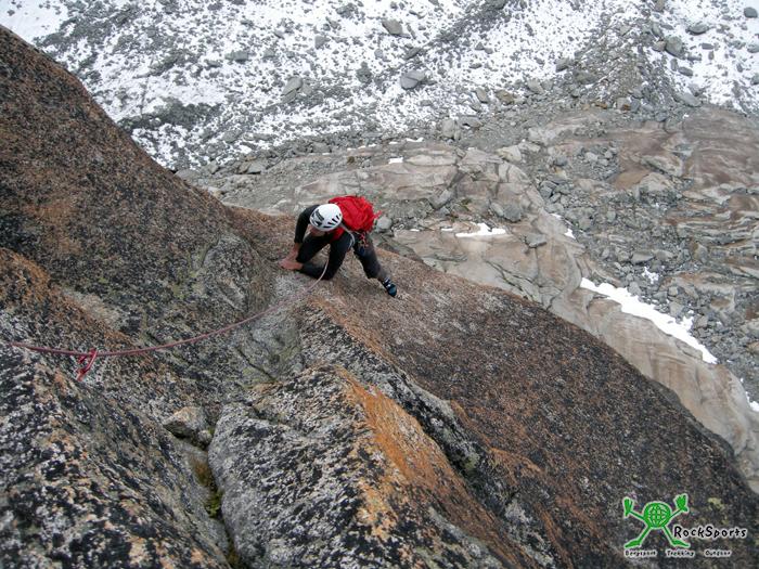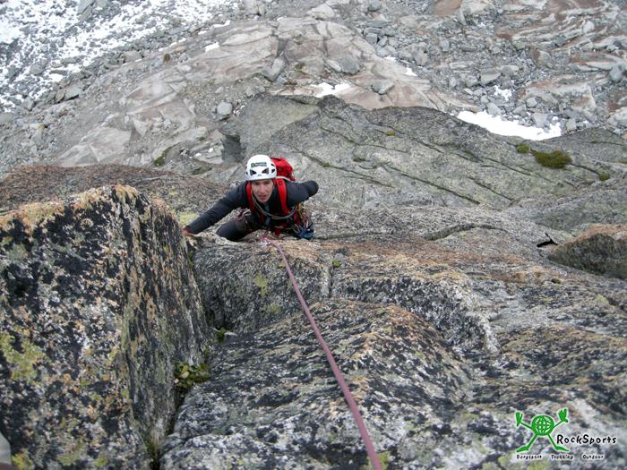 Am Einstieg war es bereits 17:00 Uhr. Schon zuvor am Bielenhorn war es kalt, doch zur Kälte kam nun noch starker Wind hinzu. Frank kannte dir Tour schon von seiner Begehung vor vier Wochen und überließ Simon und mir den Vorstieg. Ich kletterte die ersten drei Seillängen und Simon die letzten drei. Schöne und bestens abgesicherte Kletterei erwarten einen. Die Tour ist zudem sehr abwechslungsreich. In der dritten Seillängenach der Linksrampe nicht den Abzweig nach rechts in eine Verschneidung verpassen. Die vierte Seillänge bietet sehr steile und gutgriffige Kletterei. Die wohl kniffligste Stelle (VI +) folgt dann in der 5.SL, eine plattige sehr kleingriffige Passage. Besonders in den letzten zwei Seillängen war es stürmisch und kalt.