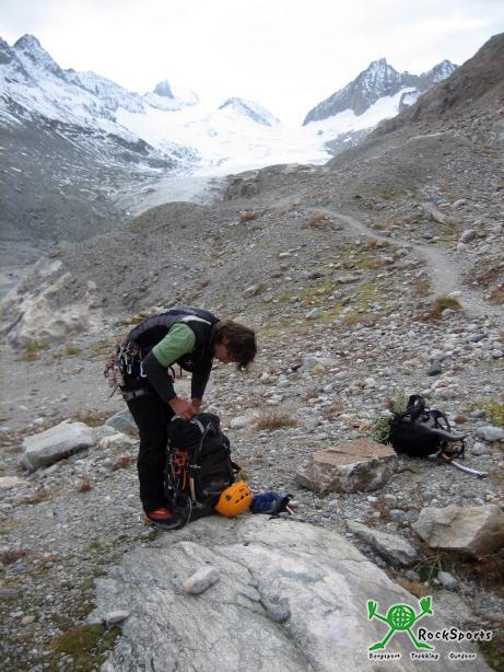 Wir kommen mit der Dämmerung am Grimselhospiz an, ein letzter Blick aufs Finsteraarhorn, großer Gott ist der Klapfen weit weg. Essen, Bier und eine kurze Nacht im Caddy, dass sind die Eindrücke vom Grimselhospiz, um 2:30Uhr ist wecken. Bis alles gekocht und gerichtet ist, wird's 3:30Uhr, dann geht's zu Fuss den Grimselsee entlang. Eine kurze Boulderstelle und wir sind auf dem guten Fussweg. Ewig geht es dahin, bis wir kurz vor Sonnenaufgang an der Lauteraarhornhütte stehen. Scheiße 200mH zu viel gelatscht, also über Leitern wieder runter zum Gletscher. Nun fangen die Berge um uns an zu Leuchten, der Tag erwacht.