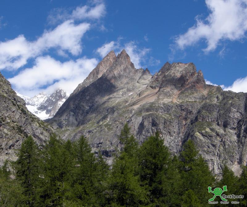 Ein kleiner Ausflug am Abend lässt mich noch das Ziel des morgigen Tages sehen und fotografieren. Mont Rouges de Triolet P.3289 - „Les chamois volants“ (5c / 18 SL / 800m). Gut fürs Foto. Am nächsten Tag werden wir den Berg leider nicht vor blauem Himmel sehen.