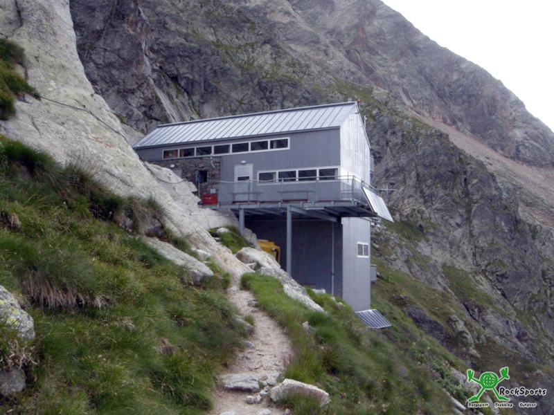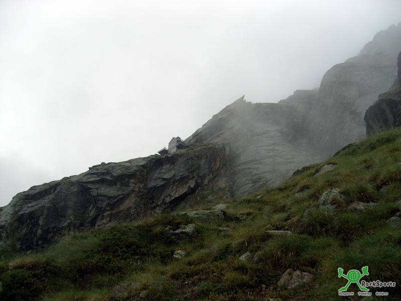 Am Fuße von Grandes Jorasses, Aiguille de Triolet und Mont Dolent liegt das wildromantische Val Ferret. Am Ende der mit dem Auto erlaubten Straße durchs Val Ferret liegt der Ausgangspunkt, Arnouva (1769 m), für den Hüttenaufstieg. Parken entweder beim Restaurant Arnouva oder noch über die Brücke (eigentlich schon Fahrverbot) drüber und 150 m danach rechts parken. Hier ist es zumindestens Nachts sehr ruhig und man kann auch übernachten. Tagsüber im August italienische Touristen ohne Ende. Nach 2 h bei gemütlichem Tempo sind wir auf der Hütte. Es regnete immer wieder und auf der Hütte fällt etwas Schnee. Der Hüttenwirt erzählt, das am morgen noch 15 cm Schnee an der Hütte lagen. Glückwunsch...wollen wir doch klettern. Wir sind die einzigen Gäste.