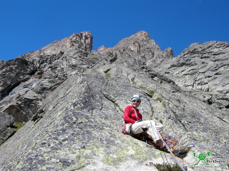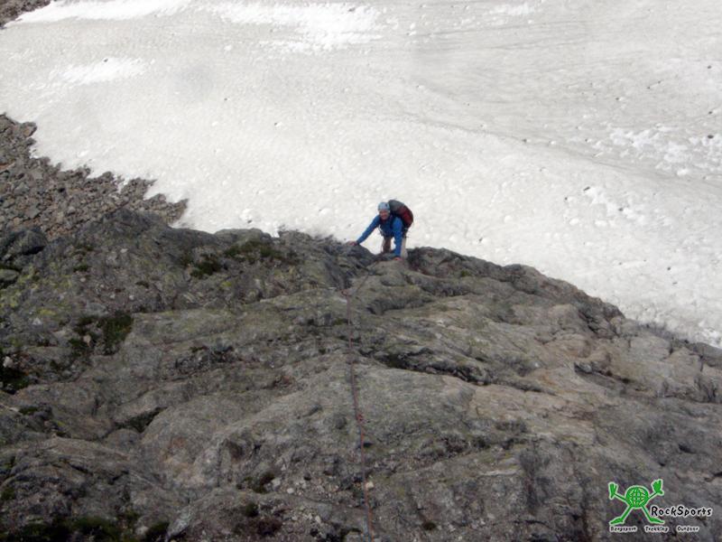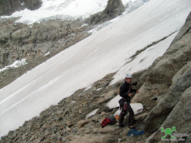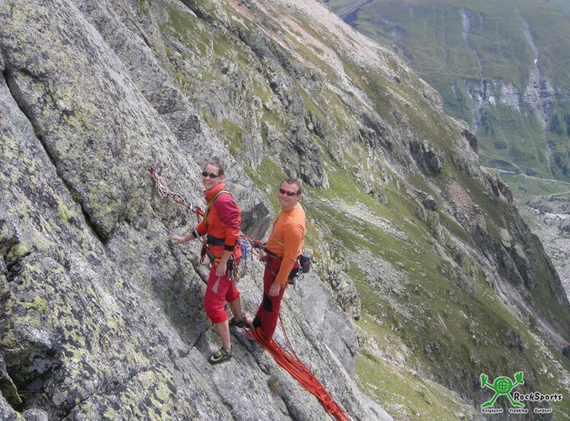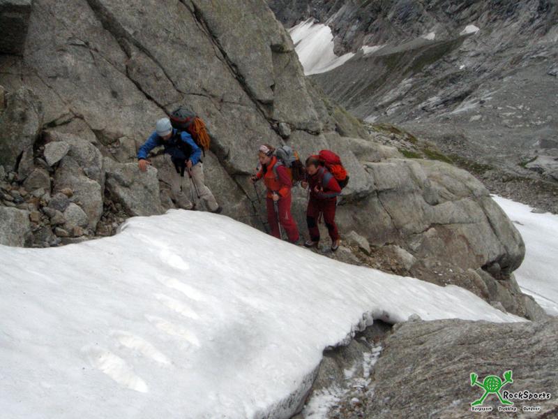 Am nächsten morgen strahlt jedoch die Sonne. Direkt aus dem Bett sieht in den vergletscherten Kessel des Glacier de Triolet. Die langen Touren sind heute jedoch nicht ideal, in der Höhe liegt einfach zuviel Schnee. Der Klettergarten und die kürzeren Touren direkt bei der Hütte sind jedoch bald trocken. Für Anne und Tim sind es mehr oder weniger die ersten Mehrseillängenrouten. Für den Nachmittag empfiehlt uns der Hüttenwirt noch eine erst wenige Wochen alte bestens abgesicherte 7 SL Tour. Sie hatte noch keinen Namen. Diese Route war sehr leicht (Stellen 5c) sehr geneigt und extrem gut abgesichert. Eine ideale Einsteiger Tour. Im folgenden ein paar Bilder:
