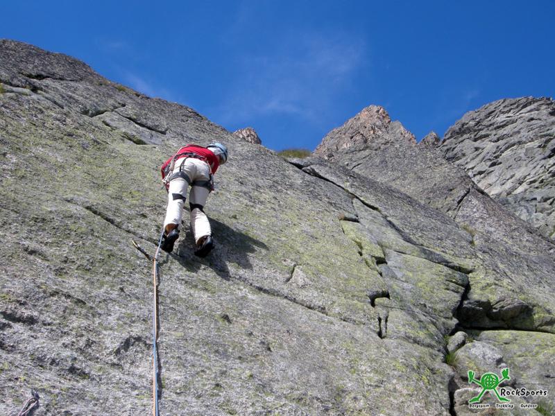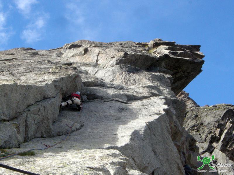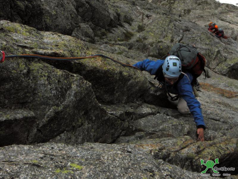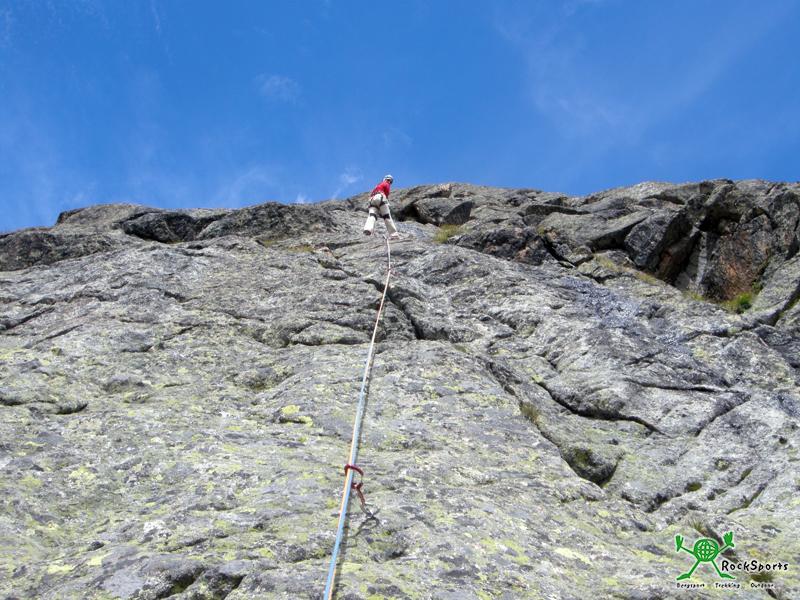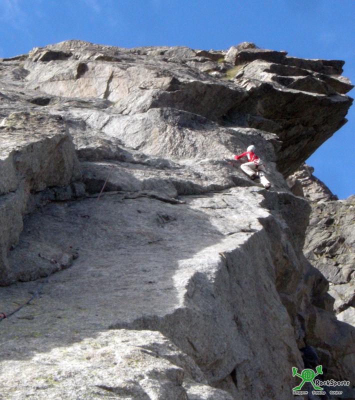 Am Einstieg liegt Schnee und sorgt kurz für nasse Kletterschuhe. Gleich am Anfang ist es sehr glatt und kompakt. Ein Cam verbessert die Absicherung. Insgesamt ist die Route aber gut mit Bohrhaken eingerichtet. Danach bieten die ersten drei Längen (V) tolle Granitkletterei. Es ist sehr kalt die Längen anhaltend, noch will Nina nicht vorsteigen.
