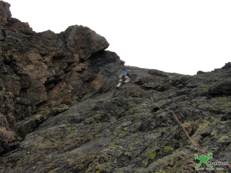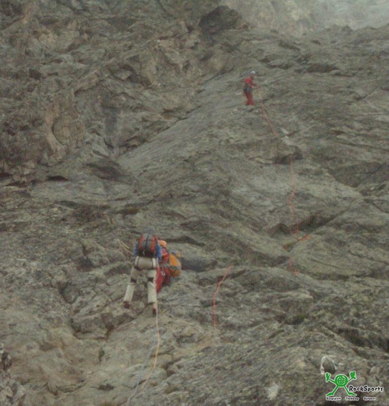 Es wird etwas leichter und kurz etwas unübersichtlich in der 4.SL. Schöne Kletterei bieten die Längen 6-8. Es hat inzwischen immer wieder leicht geregnet. Vor der 10 SL. sind wir vollständig eingenebelt und es beginnt deutlich zu graupeln. Da es schon den ganzen Tag schlecht war, konnte man auch nicht auf baldige Besserung hoffen. Nach einiger Zeit des Abwartens seilen wir leider unverrichteter Dinge ab. Etwas weiter unten treffen wir wieder auf Anne und Tim.