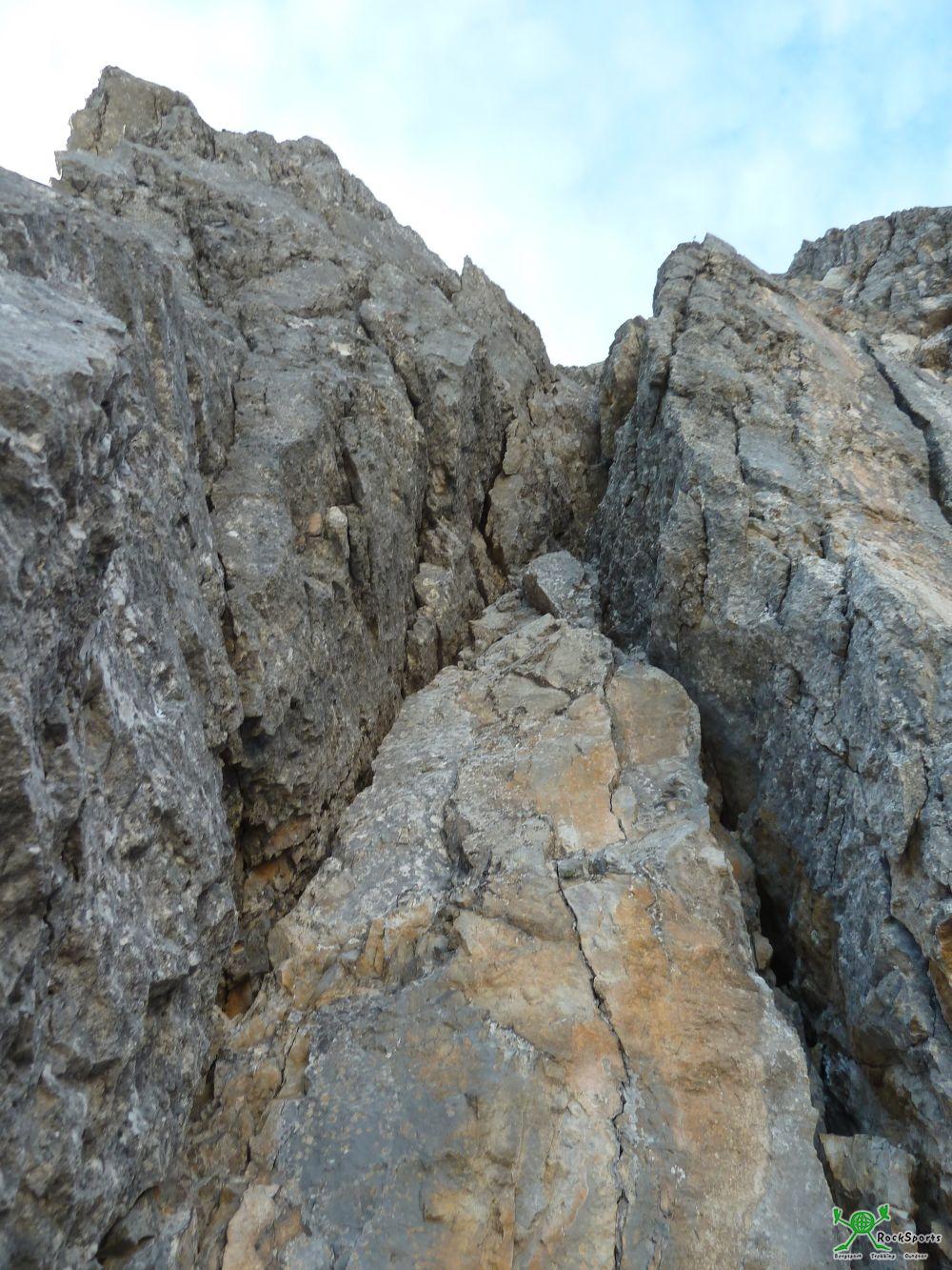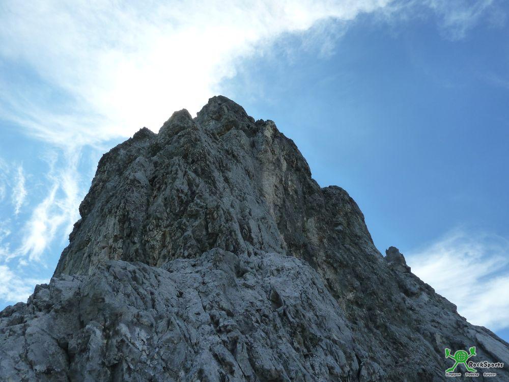 Von dort aus sieht man schon das markante Grattürmchen. Über leichteres Gelände (III-IV) hinauf in die Scharte hinter dem Türmchen und noch ca. 10 m höher bis zum Standhaken. An das Bild der umgeschlagenen geklebten Bühler Haken muss man sich gewöhnen. Es können aber alle benutzt werden. Entweder passt ein Karabiner gerade noch durch oder eine Schlingen durchfädeln.