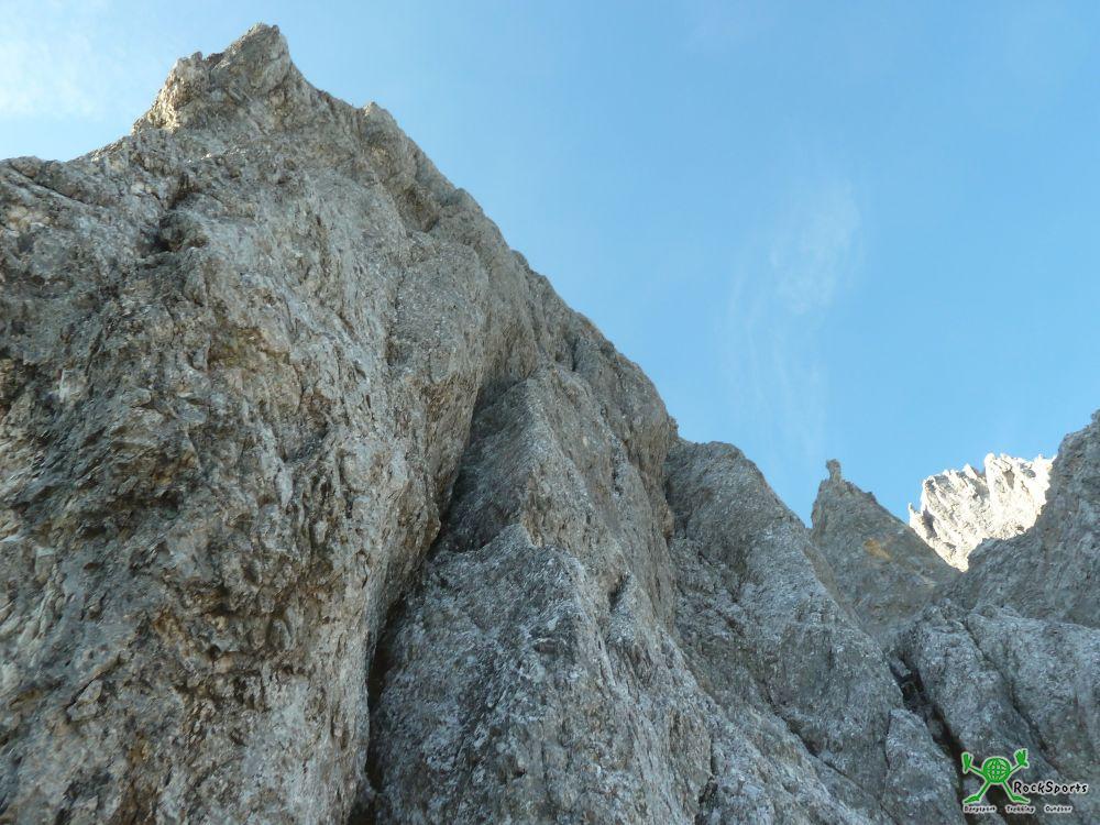 - Felsqualität: Größtenteils guter, aber dennoch klassisch alpiner Fels. Gegen Ende hin nimmt die Brüchigkeit deutlich zu