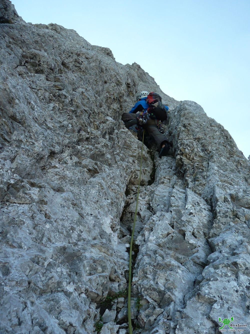 In der 3.SL verfolgt man eine steile Rampe nach links und macht am besten, wie im Panico-Topo, nach 20 m auf einem Absatz an einem Normalhaken +Cams Stand. Danach folgt in der 4. SL die steile gelb-rötliche Verschneidung (V-). Am Ende der Verschneidung unter einem Überhang nach rechts queren bis in leichteres Gelände. Ich habe die Längen teilweise zusammengefasst musste dann aber an einem nicht idealen Köpfl, am Ende der Rechtsquerung, Stand machen.