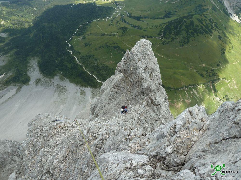 Auf dem Weg hinunter Richtung Biwakschachtel kommt man dann noch an der bekannten Steinbrücke vorbei auf welcher auch schon der Herman Buhl gestanden hat und welche man sehr deutlich schon von der Falkenhütte aus sieht. Vielmehr Luft wird man wohl nicht gleich wieder unter sich haben. Zwischen den Beinen kann man 800 m bis zum Wandfuß schauen.