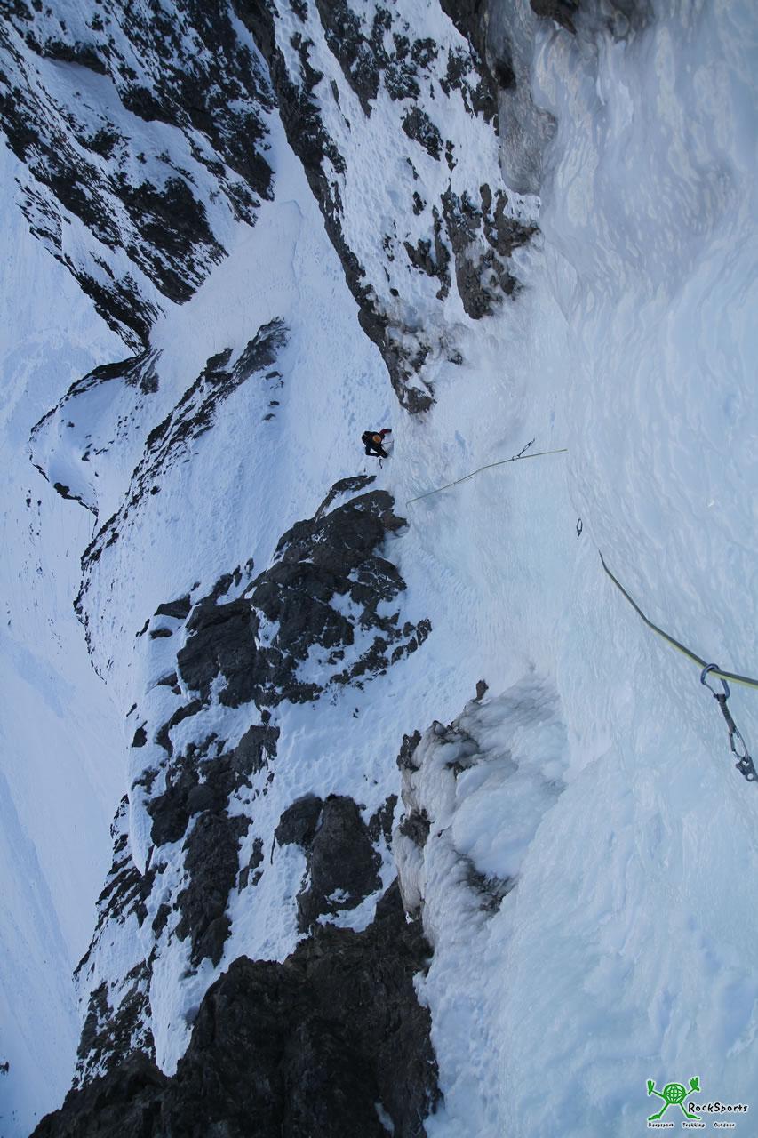 Ich hatte die "Ehre", die Schlüsselstelle mit gut 80° vorzusteigen. Im etwa 5m langen steilen Teil setzte ich recht viele Schrauben, um dann ziemlich gepumpt ins flachere Eis auszusteigen.