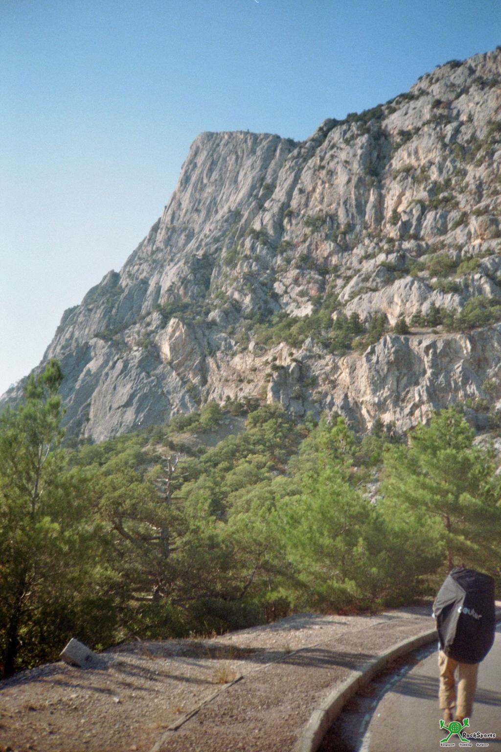 Ich bin mir jetzt gar nicht mehr sicher wo dieses Batiliman anfängt und wo es aufhört. Nataliya lies den Busfahrer auf einer Gebirgsstrasse im Nirgendwo stoppen. Sie sagte, die restlichen 5 Kilometer müssen wir zu Fuß gehen, der Bus fährt nicht so weit. Man gelangt zwar auch von der eigentlichen Bushaltestelle über die Küstenstraße zum Klettercamp Kush-Kaya, läuft aber dann dauernd in der prallen Sonne und in den Abgasen alter Wolgas, Ladas und Tatras. Den Weg, den Nataliya wählte, war die alte, für Autos gesperrte Fahrstraße. Es geht stetig bergab, durch ein schattiges, mit Büschen bewachsenes Wäldchen und ist ebenfalls nur 5 Kilometer lang. Hier und da lichtet sich das Gebüsch und gibt den Blick aufs Meer und die in einer Waldlandschaft gebetteten schroffen Felsriegel frei.
