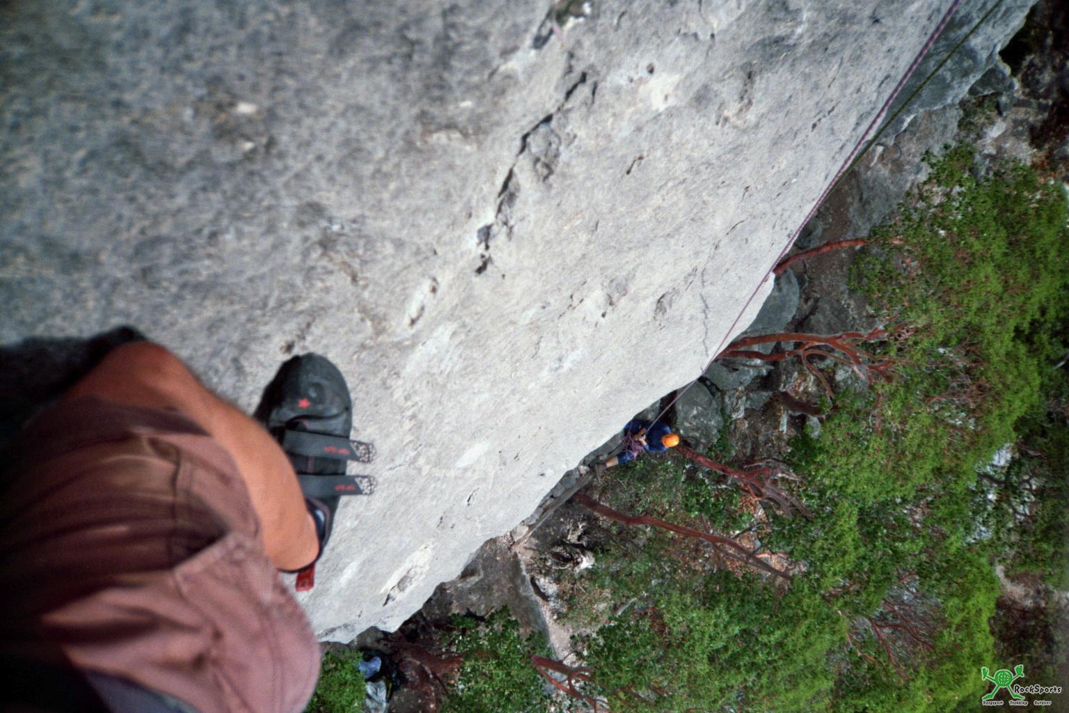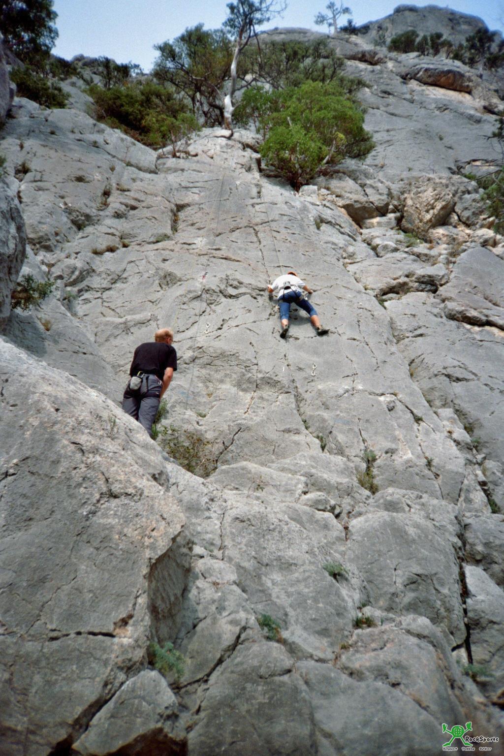 vom Campingplatz klettern, einer der beiden Litauer war schon wieder fit und ging mit ihr, um sie zu sichern. Aber all zu lange hielt ich’s dann auch nicht aus. Was soll der Käse, vom Rumsitzen wird der Rücken auch nicht besser. Also schnappte ich meinen Krempel und zog los, um die beiden zu finden. Aber so ist es halt, erst hat man keine Lust, dann überwindet man sich doch, und am Ende hat man nen richtig tollen Tag. Und so war’s dann auch! Es ist schon irre, zu hause, im Blautal, sucht man verzweifelt Halt auf einem speckigen Minitritt. Dort klettert man halt einfach los! Anfangs suchte ich wie gewohnt einen sicheren Tritt. Hab ich dann aber bald bleiben lassen, da kannste gleich auf Reibung gehen. Die Felsen da sind so unglaublich rau! Ich wagte mich an Routen, die ich im Blautal nie klettern würde. Allein schon der Absicherung wegen. Auch Nataliya hat ihre Linie wieder gefunden. Darum war ich echt froh!