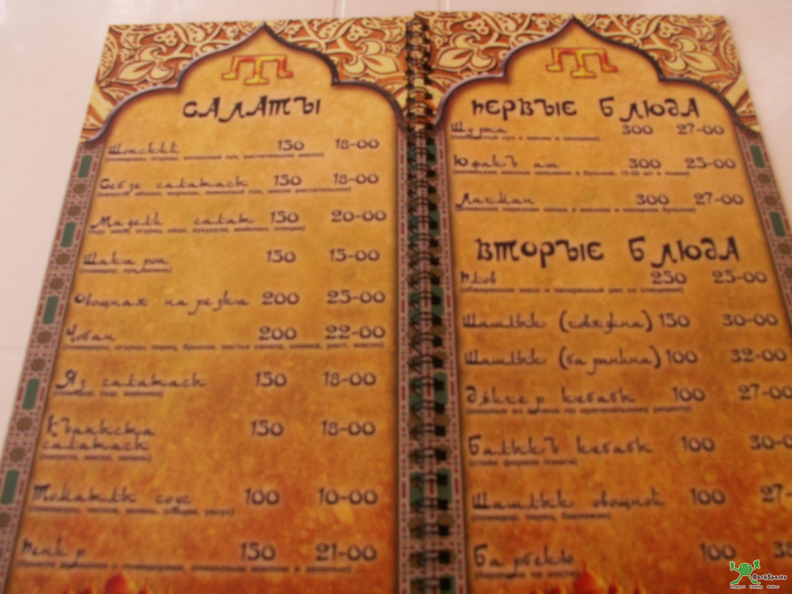 Dort lud ich dann Nataliya zum Geburtstagessen in ein tatarisches Restaurant ein. Traditionell nimmt man in bei den Tataren seine Mahlzeiten halb im Liegen an einem speziellen Esstisch ein. Aber werfen wir doch mal einen Blick auf die Speisekarte.