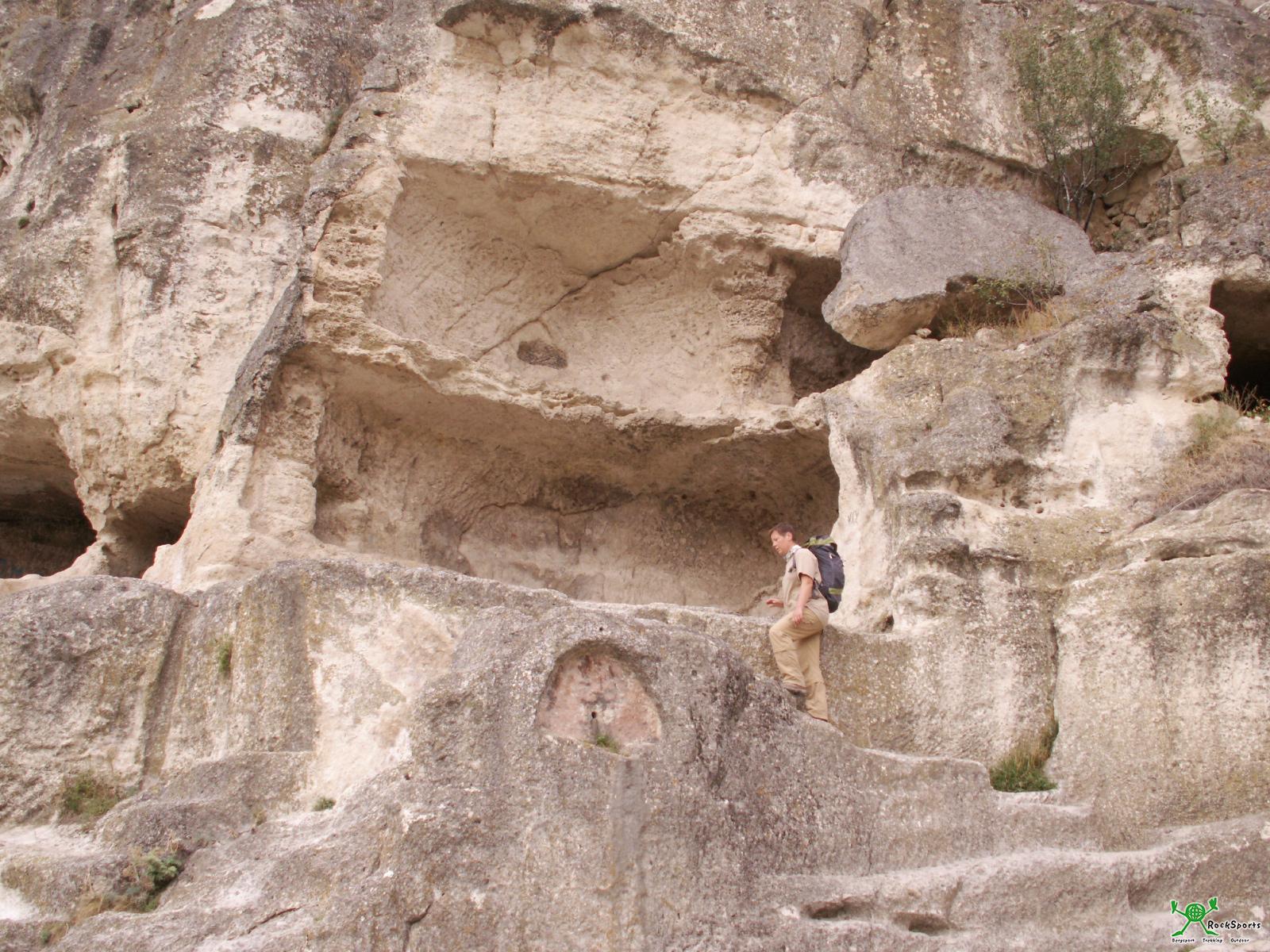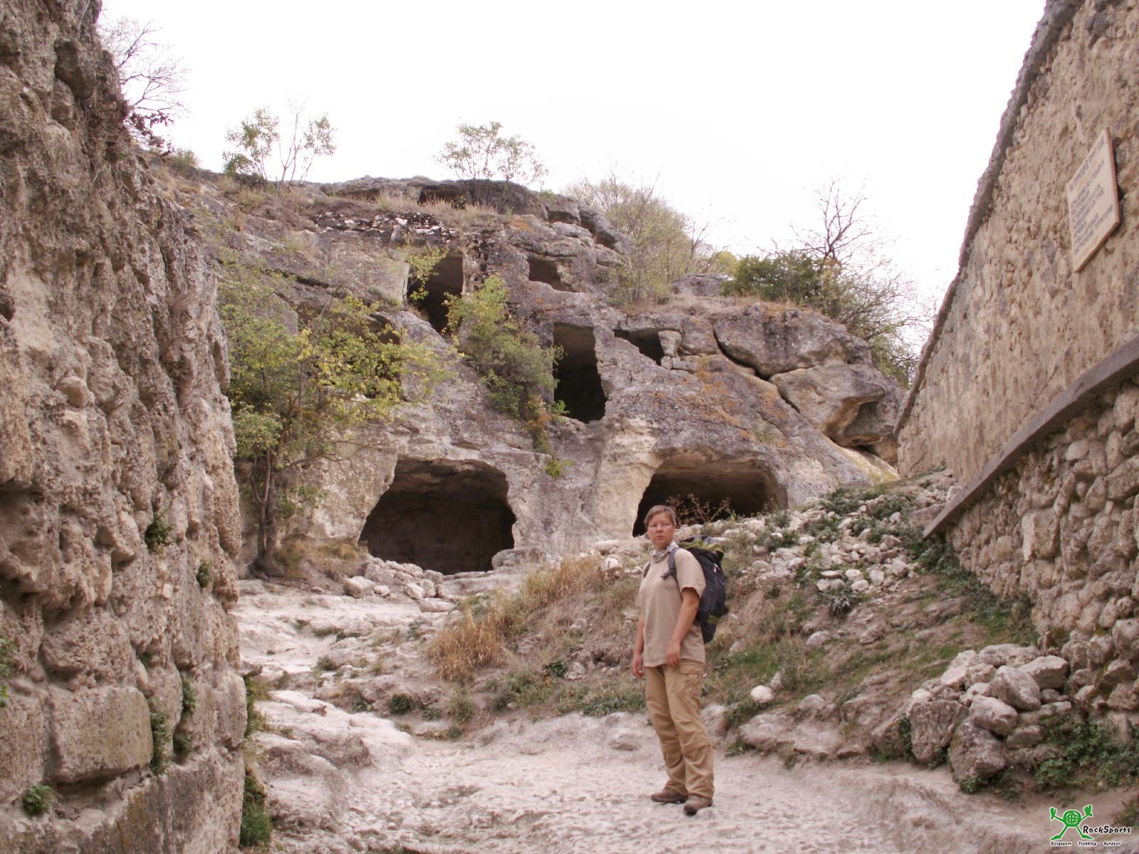 So was kannte ich bis jetzt nur aus dem Fernsehen. Wir haben auch nicht viel Zeit mit Frühstück verschwendet, sondern sind gleich los. Nataliya wollte mir das, in den Fels gemeißelte, kyrillische Kloster Uspienski aus dem 8. Jahrhundert und die noch ältere Höhlenstadt Tschufut Kale zeigen.