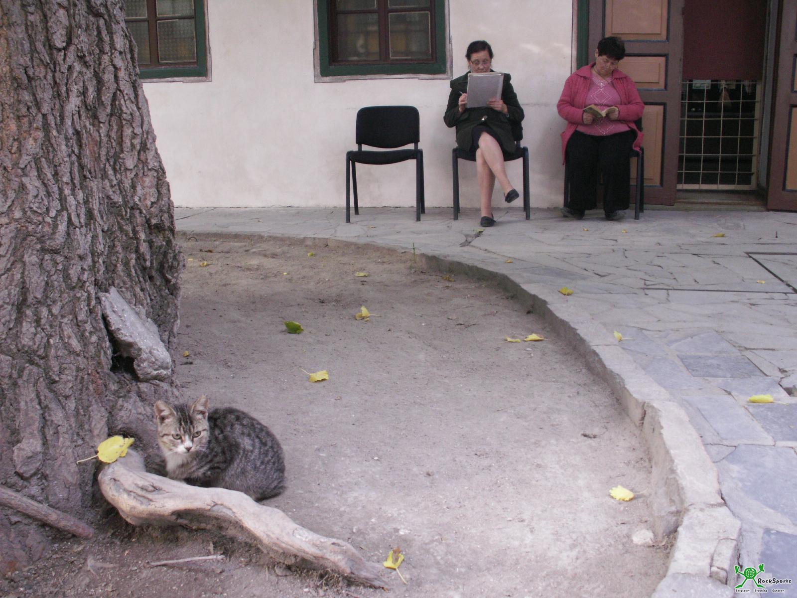 Ich blieb noch ein bisschen liegen, bouldern ist eh nicht so mein Ding…Bodenturnen für Fortgeschrittene. Außerdem war es gerade echt gemütlich hier und ich lauschte den beiden Litauern, die etwas rechts vom Camp lautstark in der Wand kletterten. Sie waren morgens zur selben Zeit wie wir aufgebrochen. Einer der beiden erzählte mir am Abend zuvor, dass sie Vertreter der rustikalen Art des Alpinkletterns sind, also ohne Bohrhaken und so’n Zeug, dafür mit Eisen und Hammer. Das waren zwei aufgeweckte, lustige Typen, spielten unentwegt mit den Katzen oder waren am essen. Aber wehe eine der Katzen machte sich an ihrem Proviant zu schaffen! Leider weiß ich die Namen der beiden nicht. Aber wenn sie so neben einander standen erinnerten sie mich an zwei weltberühmte Schwarzweiß Filmstars aus den 20ern. Ihr wisst schon welche ich meine. Nach einer gefühlten halben Stunde machte ich mich dann doch auf den Weg zu den Beiden und boulderte noch ein wenig mit.