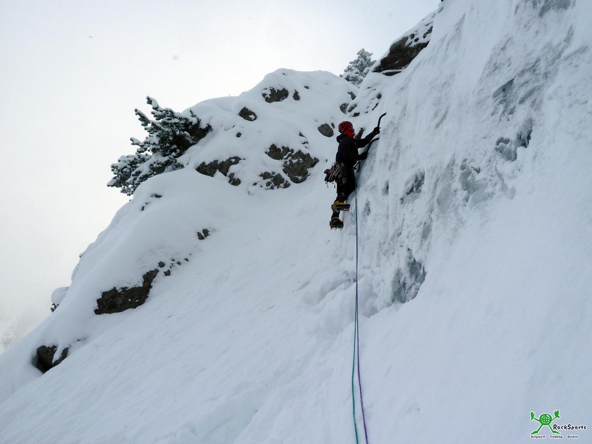 Die Eismengen hielten sich dann wie schon erwartet in Grenzen und den einen oder anderen Steinkontakt gab zu verzeichnen. Außerdem lag auf dem Eis sehr viel Schnee und war auch vielfach ins Eis eingeschlossen. Trotzdem lässt sich bei entsprechender Linienwahl eine passabel kletterbare Linie finden. Nach den 4 Seillängen sind wir wieder abgeseilt. Zuerst 55 m von einer Latsche am linken Rand, dann mittels Abalakov bis aufs breite Schneeband, zwischen 1. und 2. Seillänge. Anschließend in mindestens hüfttiefer Wühlerei im Linksbogen (Abstiegssinn) zurück in die Schlucht und zu den Rucksäcken.